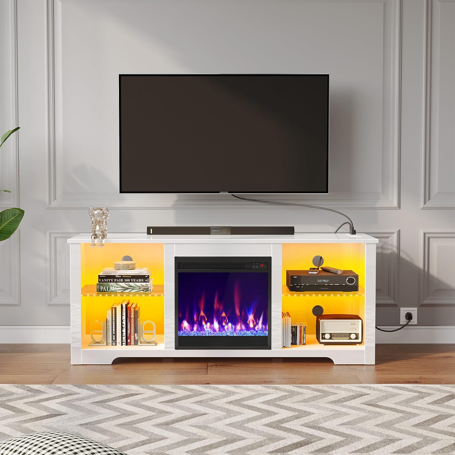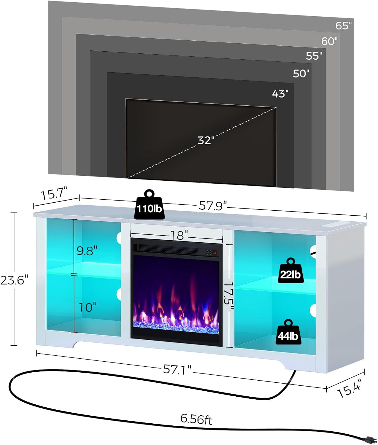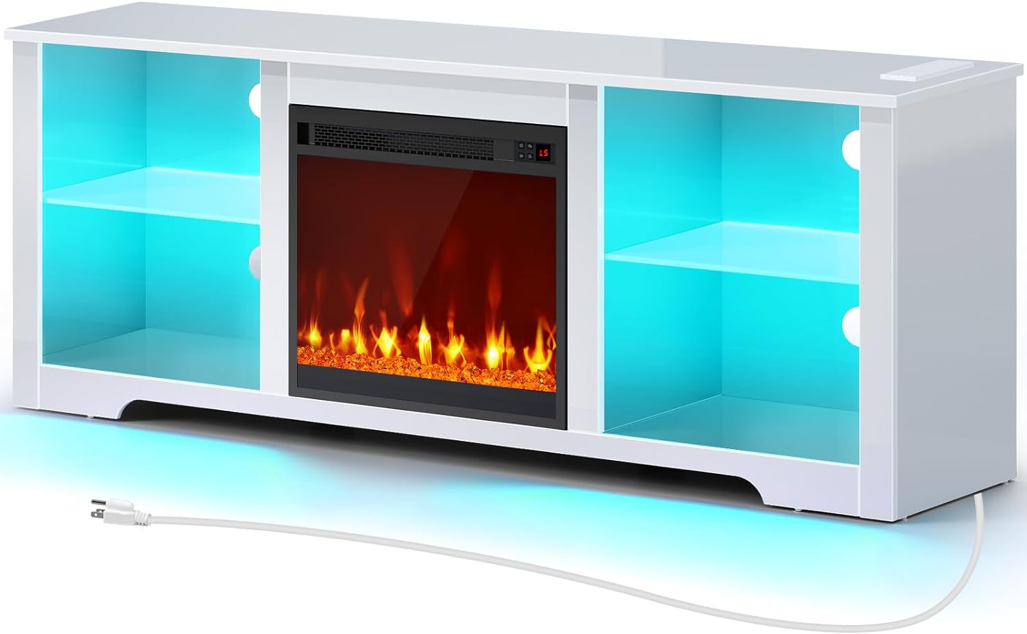 Adjustable LED Light: Enjoy the fireplace entertainment center with vibrant multi-color RGB LED light strips. 60,000 colors controlled by controller enables you customize brightness, color, mode, and timer settings. The LED lights also sync with music, creating a romantic and energetic atmosphere for parties
