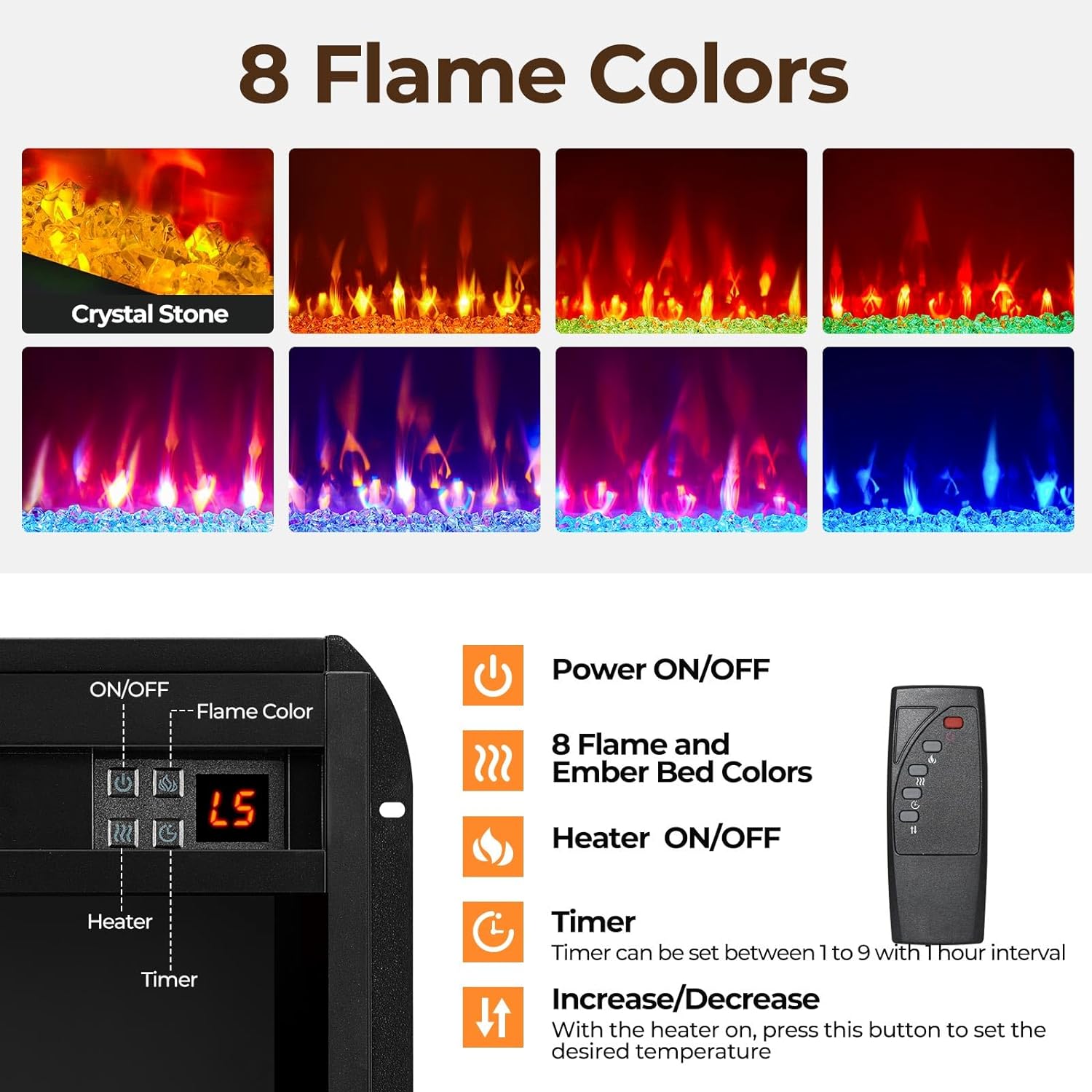 Inset Electric Fireplace: The color-changing electric fireplace has 9 temperature levels that can be adjusted between 64°F and 82°F. The electric fireplace comes with realistic crystal stones featuring 8 realistic flame and ember bed colors. So you can customize the lighting atmosphere. Dancing flames and burning effects create a realistic fireplace atmosphere in your living room