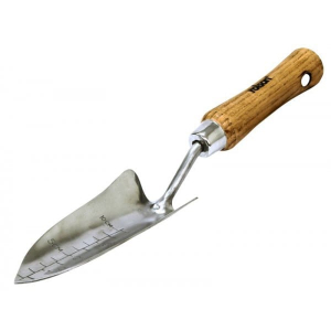 Stainless Steel Transplanter Ash handle with leather wrist strap. Mirror polished head.