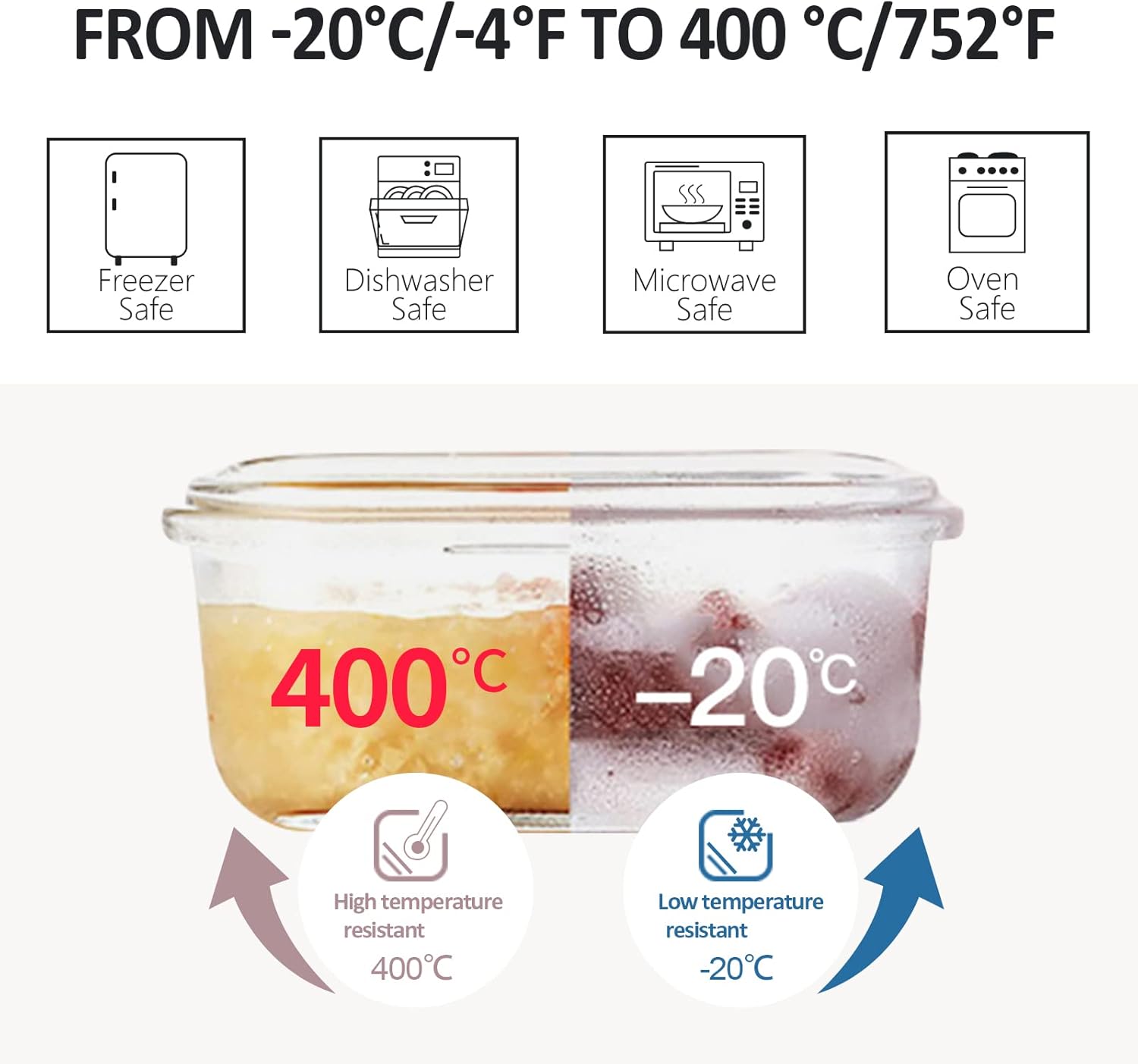 [FREEZER-TO-OVEN-SAFE GLASS FOOD CONTAINERS] The glass meal prep containers are made of superior borosilicate glass, strong and not easy to broken. The glass containers can withstand -20℃ to 400℃. Microwave/oven/dishwasher safe (not the lid) and freezer safe. Stackable design is great for food storage.
