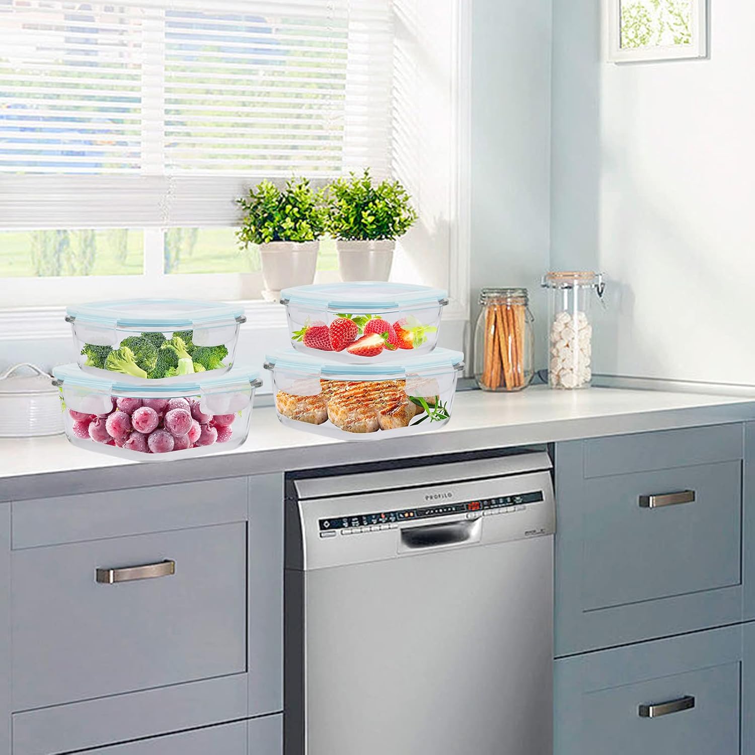 ROSOS Glass Food Storage Containers with Airtight Lids, 100% Leak Proof Glass Containers with Lids, Not Easy Broken & BPA Free, Glass Food Containers with Lids for Freezer to Oven Safe, 4 Pack, Blue