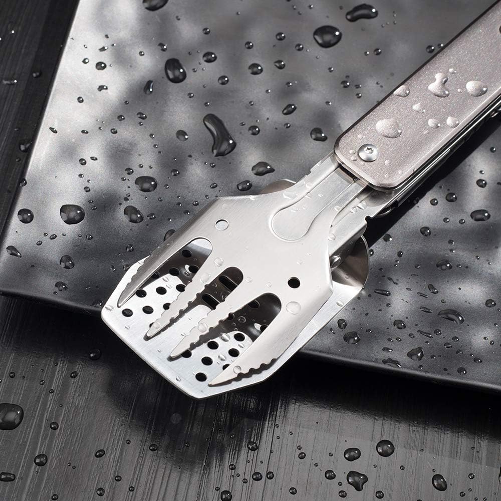 UNIQUE COMPACT DESIGN: Tools includes Spatula, Fork, Tongs, and Bottle Opener. Everything the Grill Master needs in one tool!