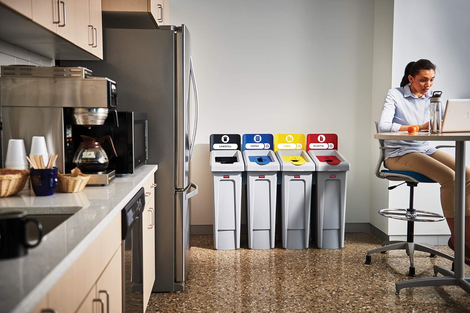 Designed for ease of use: Sized to fit, the slim footprint fits into tight spaces, while hinged lids allow larger recyclables to easily fit inside