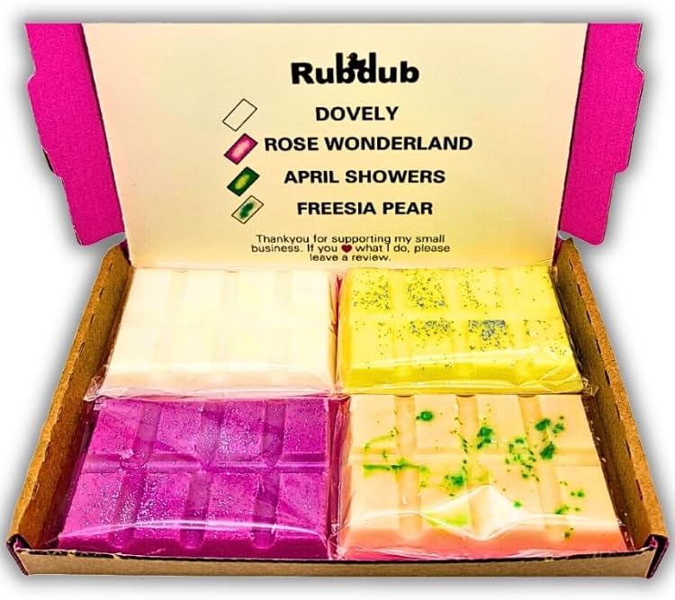 Be the first to review “Rubdub 4 X 30G Soy Wax Melt Snap Bars (April Showers/Pear & Freesia/Rose Wonderland/Dove) – 100 Hours + Burn Time – Highly Scented – Wax melts gift set, Wax melts strong scented (Spring Collection)” Cancel reply
