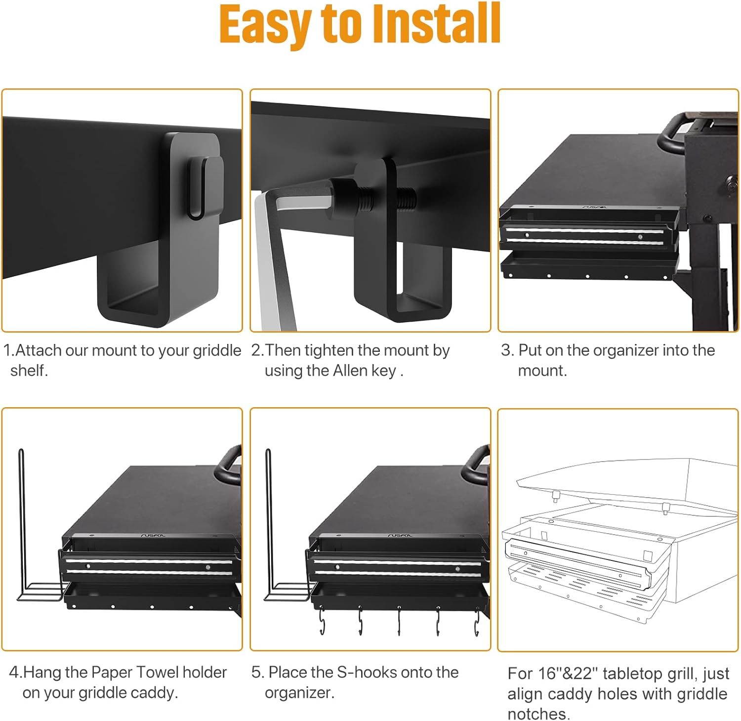 Easy to Install: The grill caddy is user-friendly and can be installed easily. Our Blackstone griddle caddy is approximately 13″x4.9”x4.3″, it is stylish and keeps the tabletop less cluttered, package included: 1 x Blackstone Griddle Organizer with Magnetic BBQ Utensil Strip, 1x Paper Towel Holder, 5x S-hooks, 2x metal mounts, 2x screws&1x Allen key.