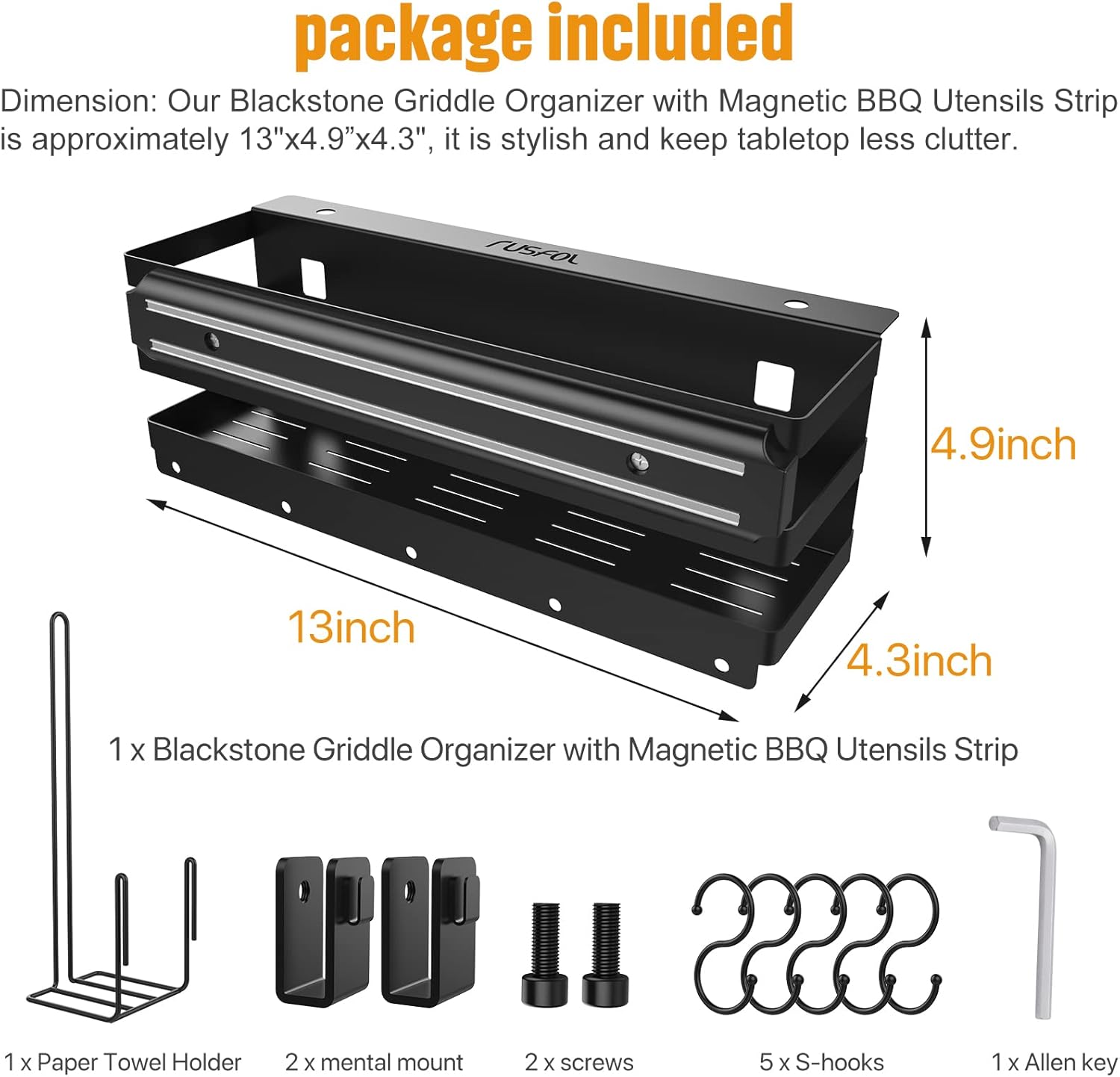Package Included: 1 x Blackstone Griddle Organizer with Magnetic BBQ Utensil Strip, 1x Paper Towel Holder, 5x S-hooks, 2x metal mounts, 2x screws&1x Allen key.