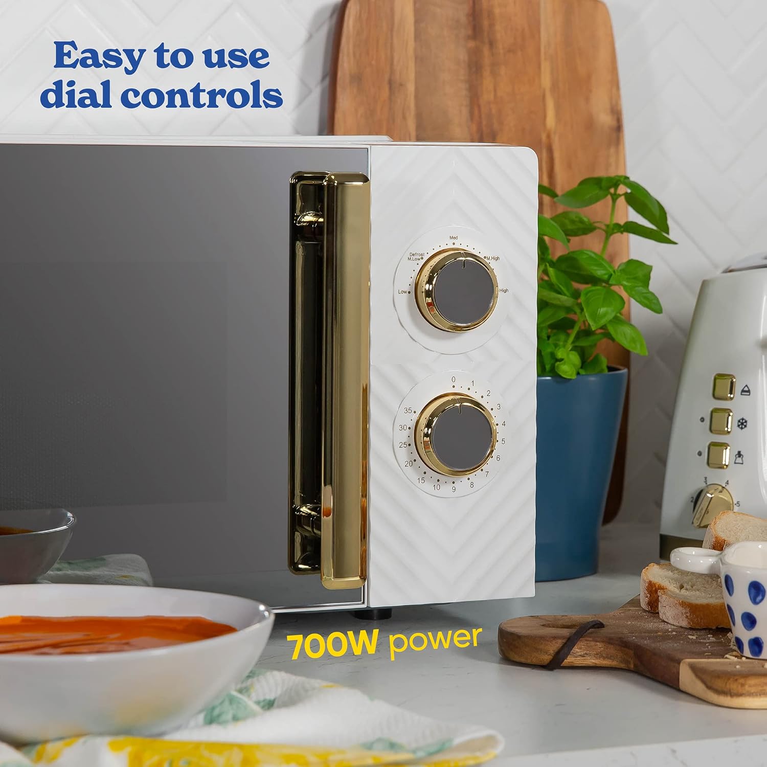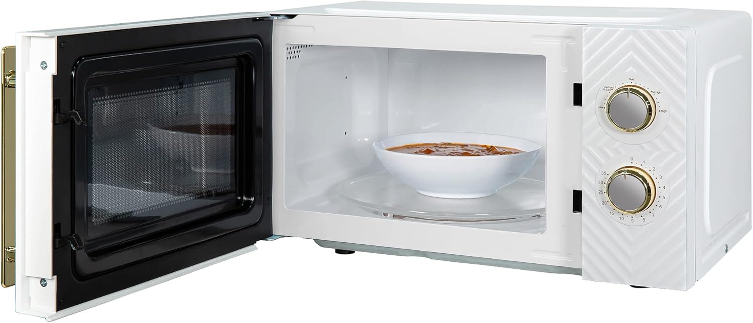 This contemporary, 17L microwave will be sure to make a statement in your kitchen with its premium Groove design control panel, sleek mirror door finish and gold accents. Ideal for cooking a variety of meals in minutes, this microwave is the perfect everyday microwave; both practical and stylish. This attractive appliance is simple and easy to use. Offering 700 watts of microwave power, cooking your favourite meals is quick and convenient. Plus, there’s plenty of space for a round dinner plate up to 10.5″ (26.6cm). There are 5 different power levels to choose from, offering you complete cooking control. For added functionality, there’s also a defrost setting, saving you time so that you can heat meals straight from the freezer. The easy-to-use pull handle, controls and dial makes cooking your favourite meals simple. The internal microwave light lets you know that cooking is in progress plus the handy ringer function lets you know that your cooking cycle has finished. Cooking has never been so easy! For added peace of mind, this microwave comes with a 1 Year Guarantee. This way, in the unlikely event something goes wrong, you know we’ll always be on hand to help.