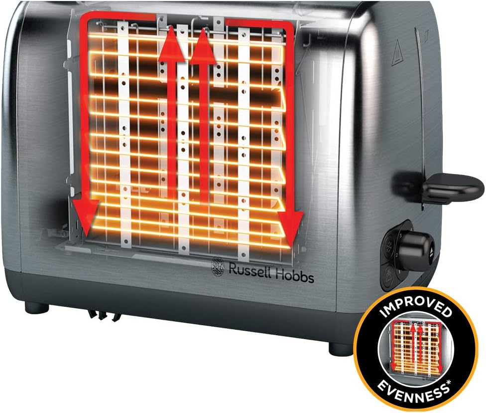 Russell Hobbs 2 Slice Toaster with Perfect Toast Technology for improved evenness (Wide slots, Lift & look feature, 6 Browning levels, Frozen & Cancel function, 850W, Brushed & Stainless Steel) 24080