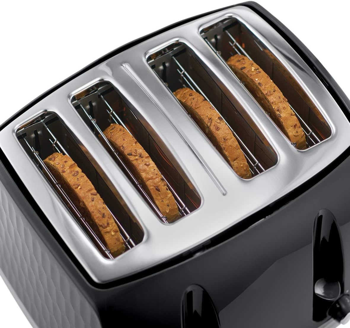 Textured Design – The Honeycomb 4 Slice Black Toaster has a Textured Design with Stainless Steel Accents, that makes a statement on any kitchen counter.