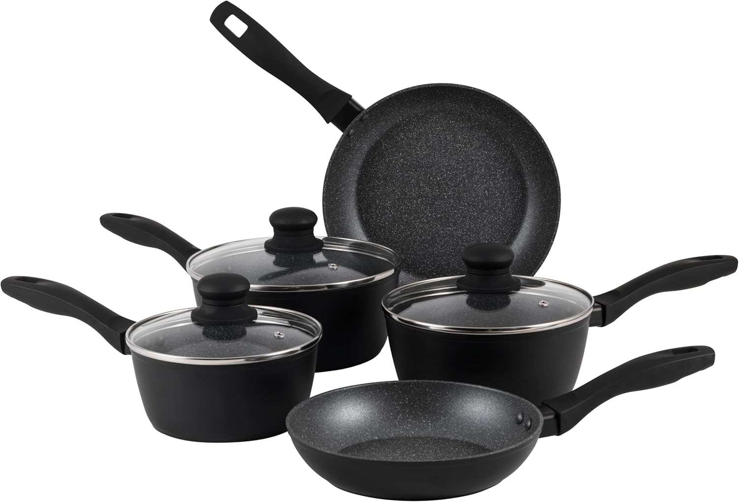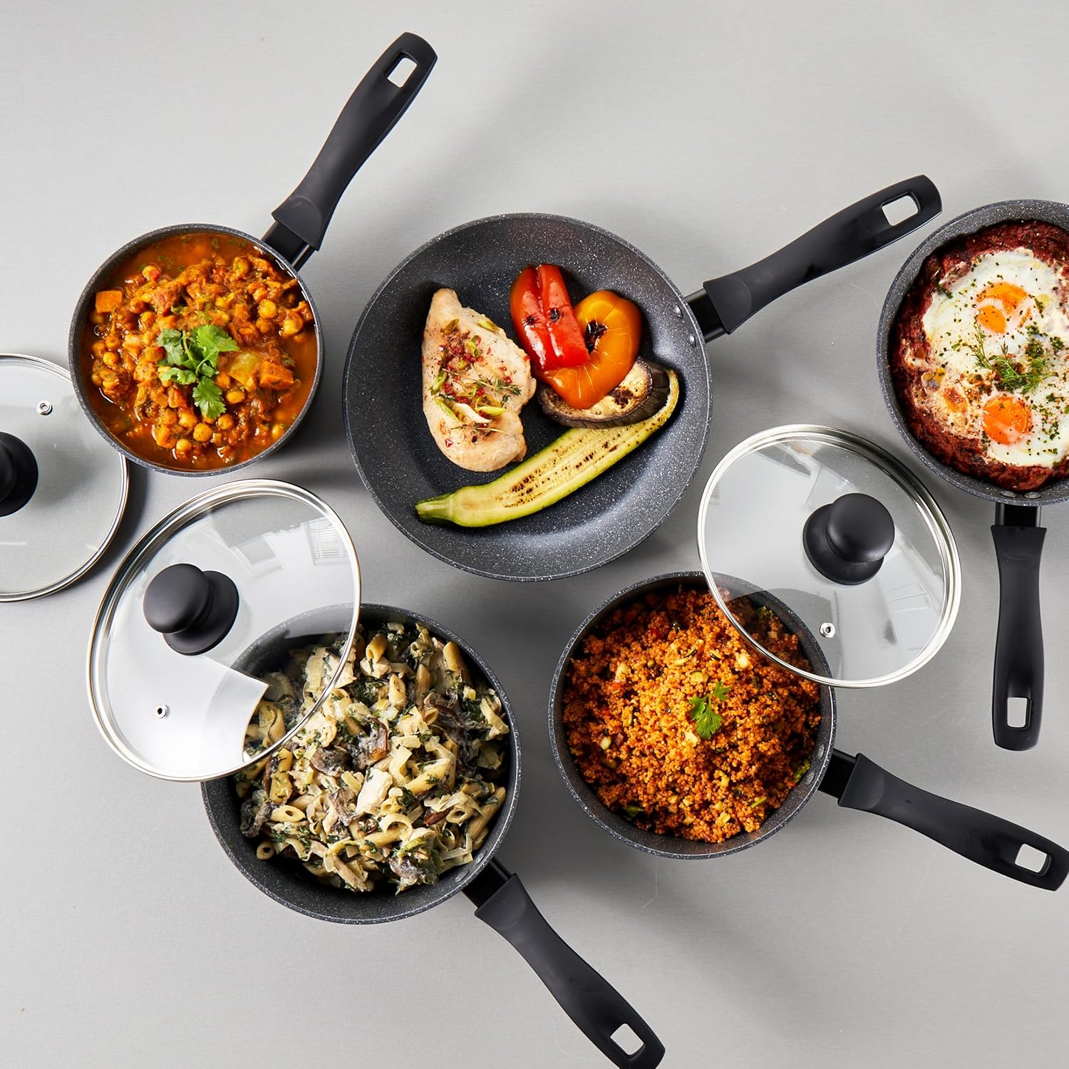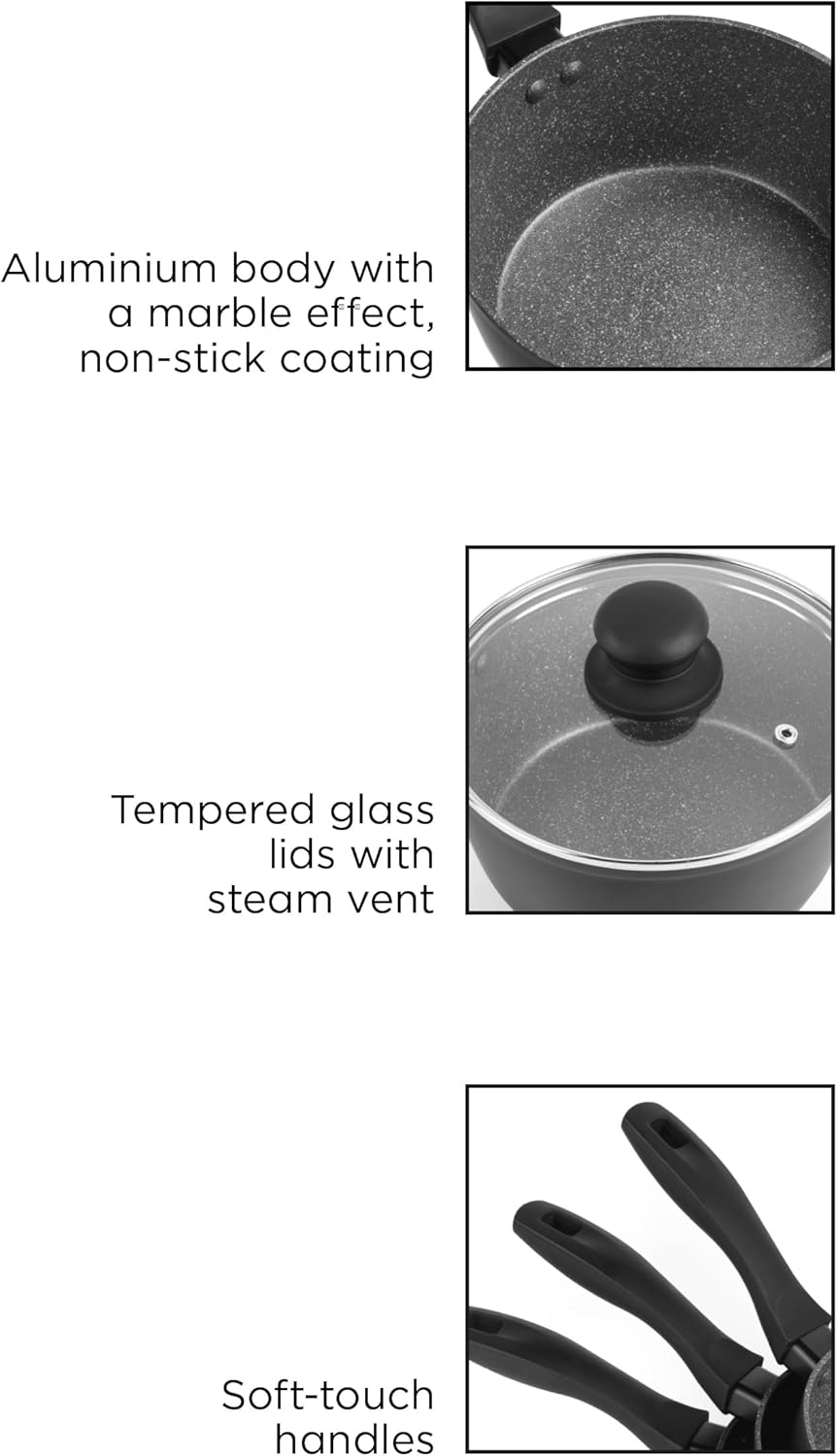 The pan set features a non-stick marble-effect coated interior for easy cleaning and cooking with less oil for healthier meals.