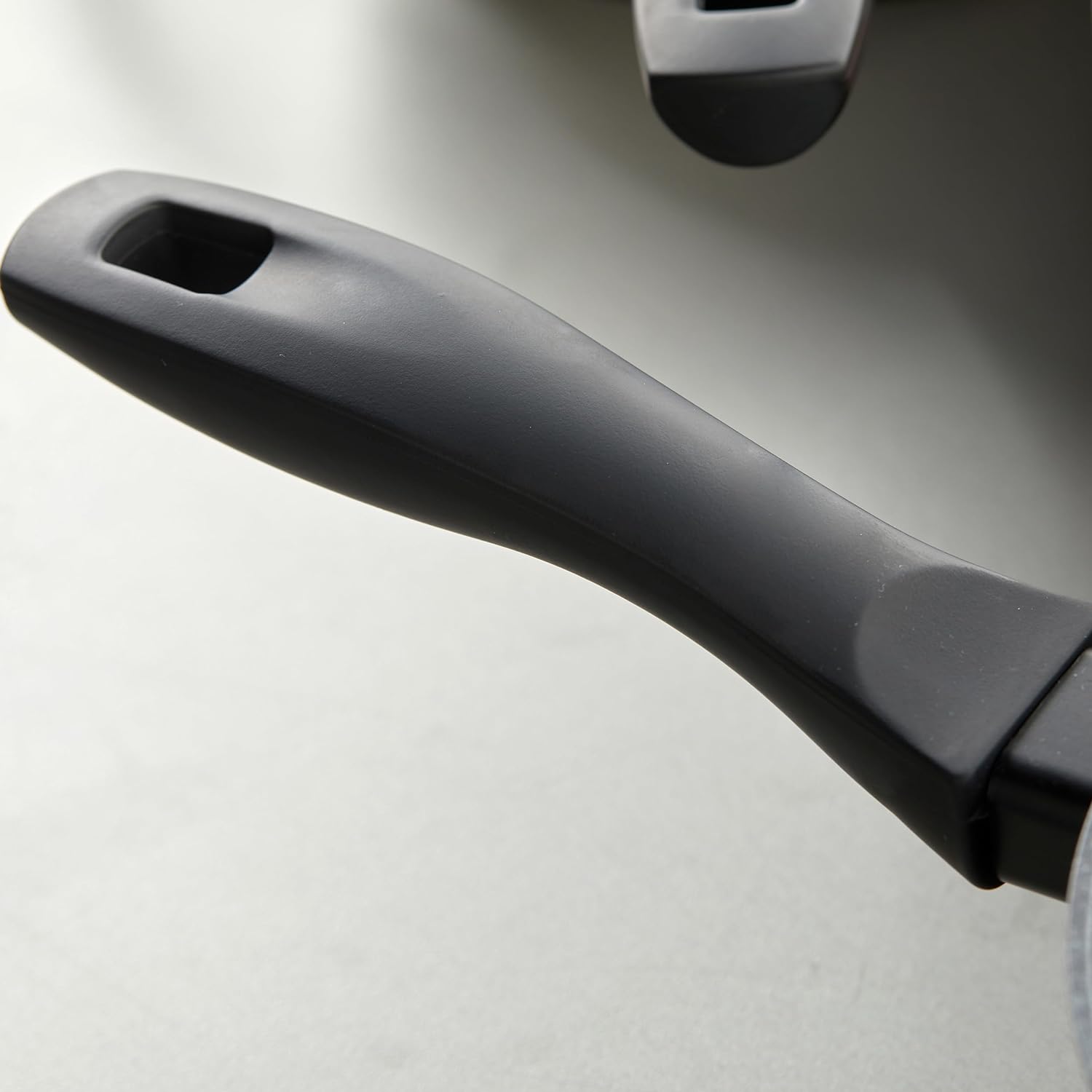 The saucepans feature tempered glass lids with steam vents, ideal for boiling pasta and vegetables, or simmering sauces and soups.