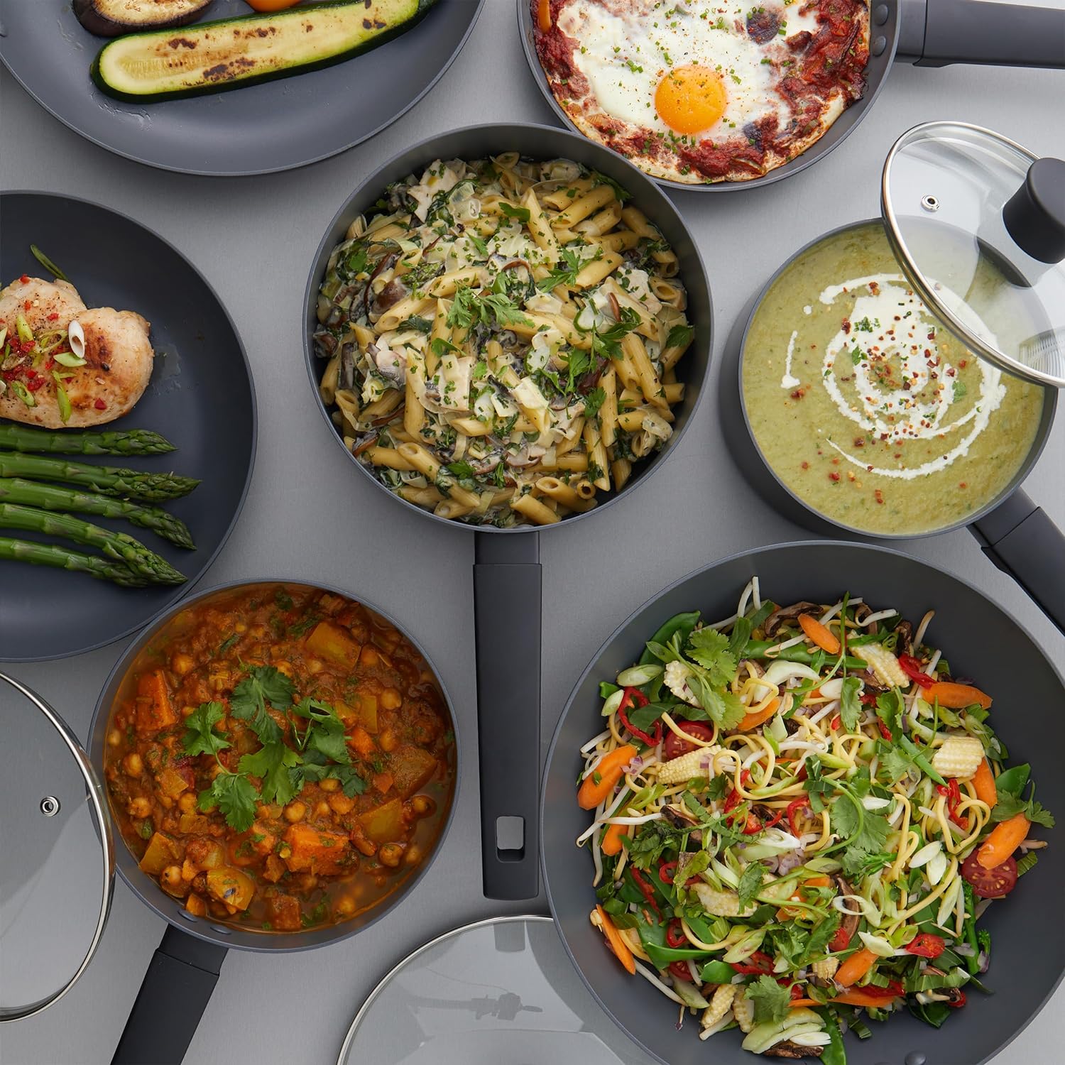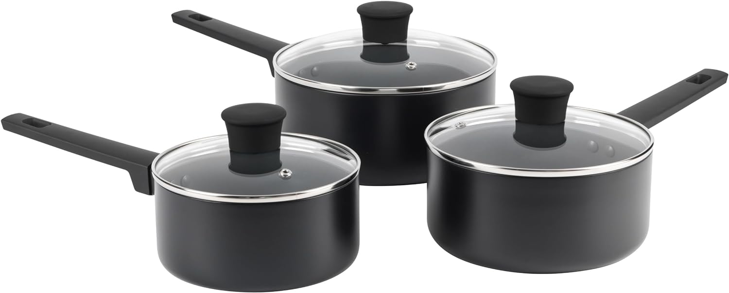 This essential collection includes saucepans with lids, frying pans, and a stir fry pan.