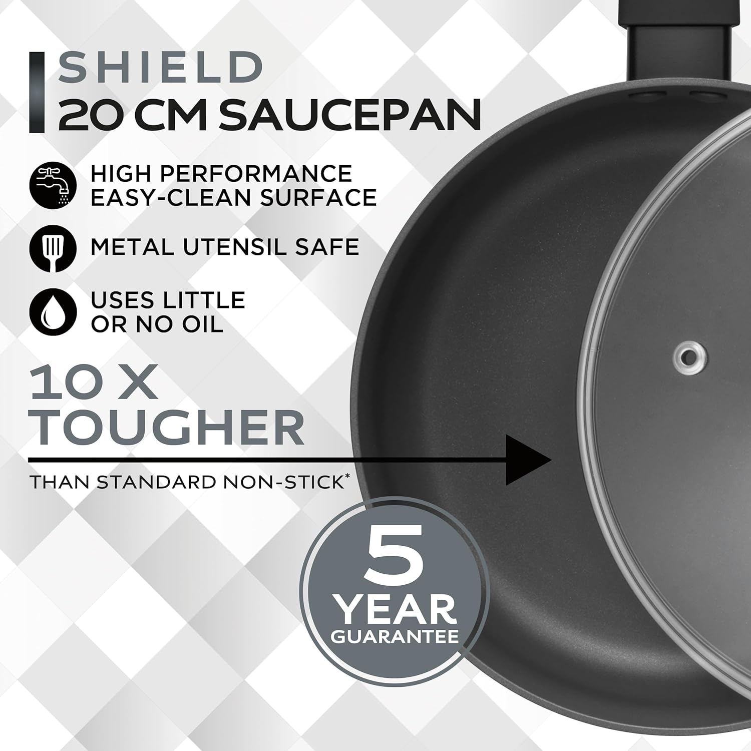 Providing a peace of mind, the Shield saucepan comes with a 5-year guarantee, ensuring this cooking pot provides long-lasting quality.