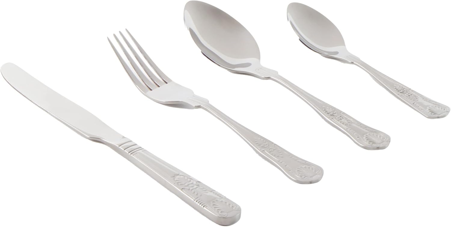 This set contains six forks, six knives, six dessert spoons and six teaspoons, perfect for dinner parties and family meals.