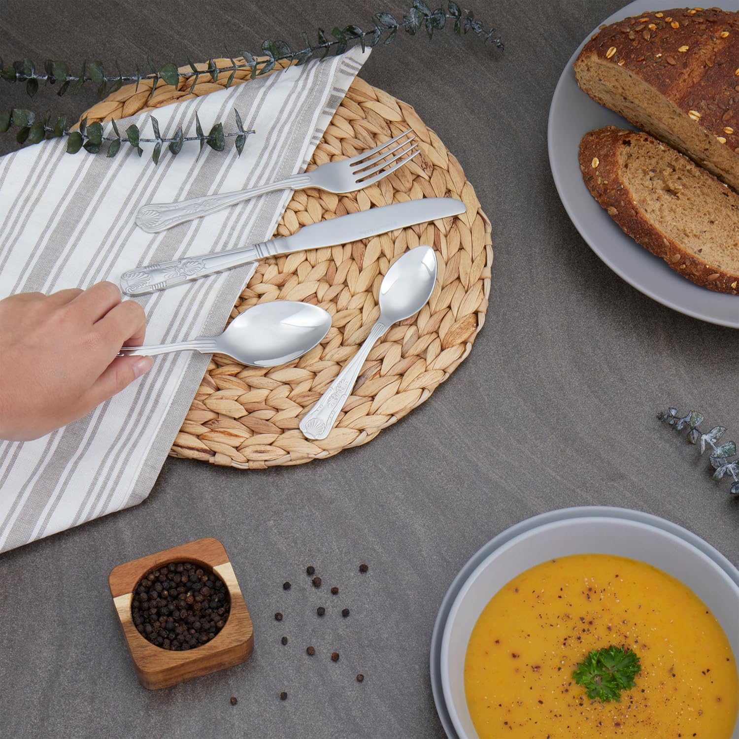 A timeless addition to any table, this reliable 6 place setting dinnerware cutlery is finely balanced with intricately decorated handles.