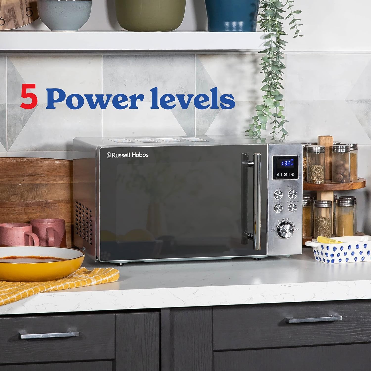 The Russell Hobbs RHM2086SS Buckingham microwave has a sleek and stylish contemporary design, boasting an attractive mirror door finish, stainless steel fascia, and blue LED light.