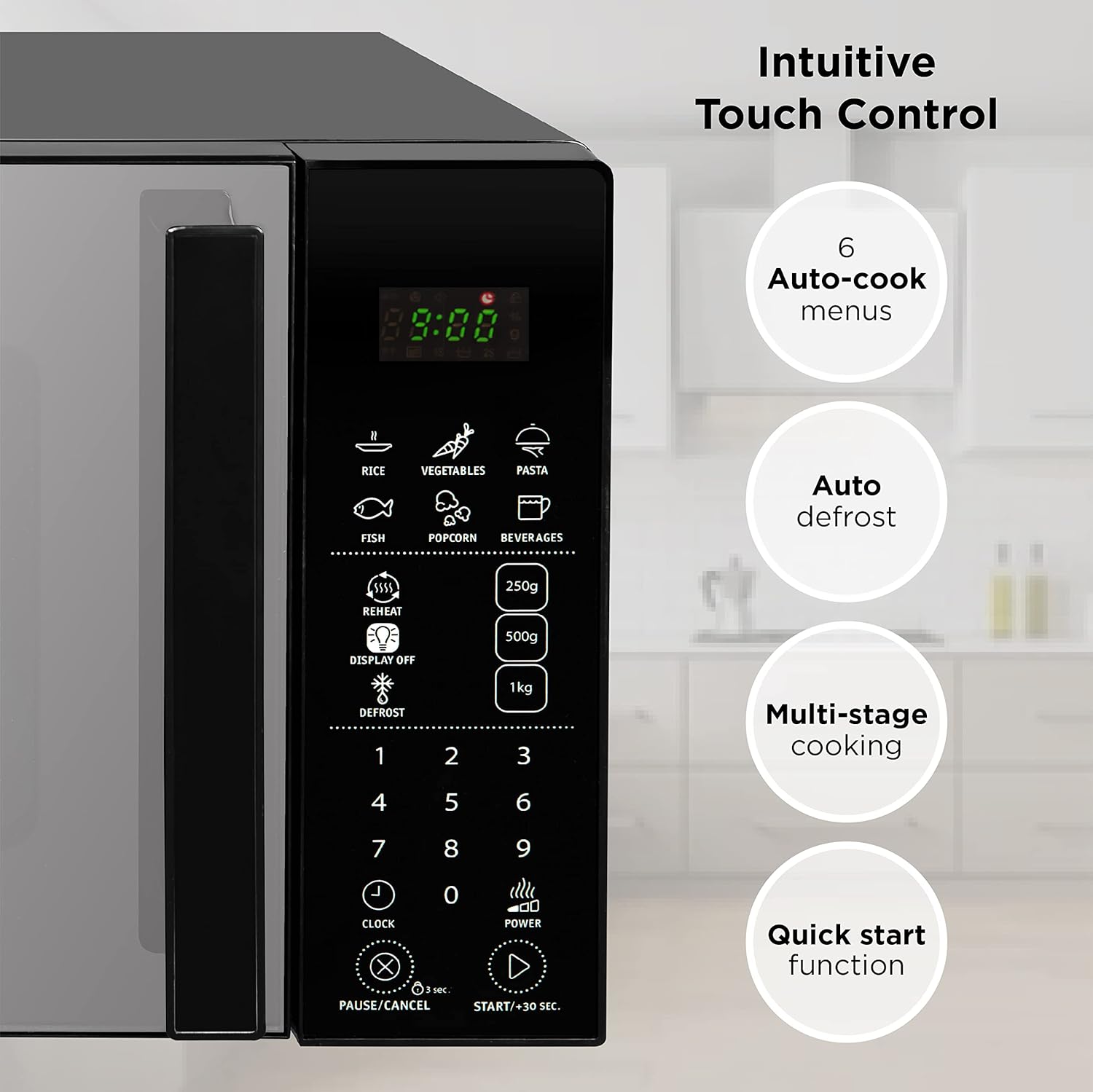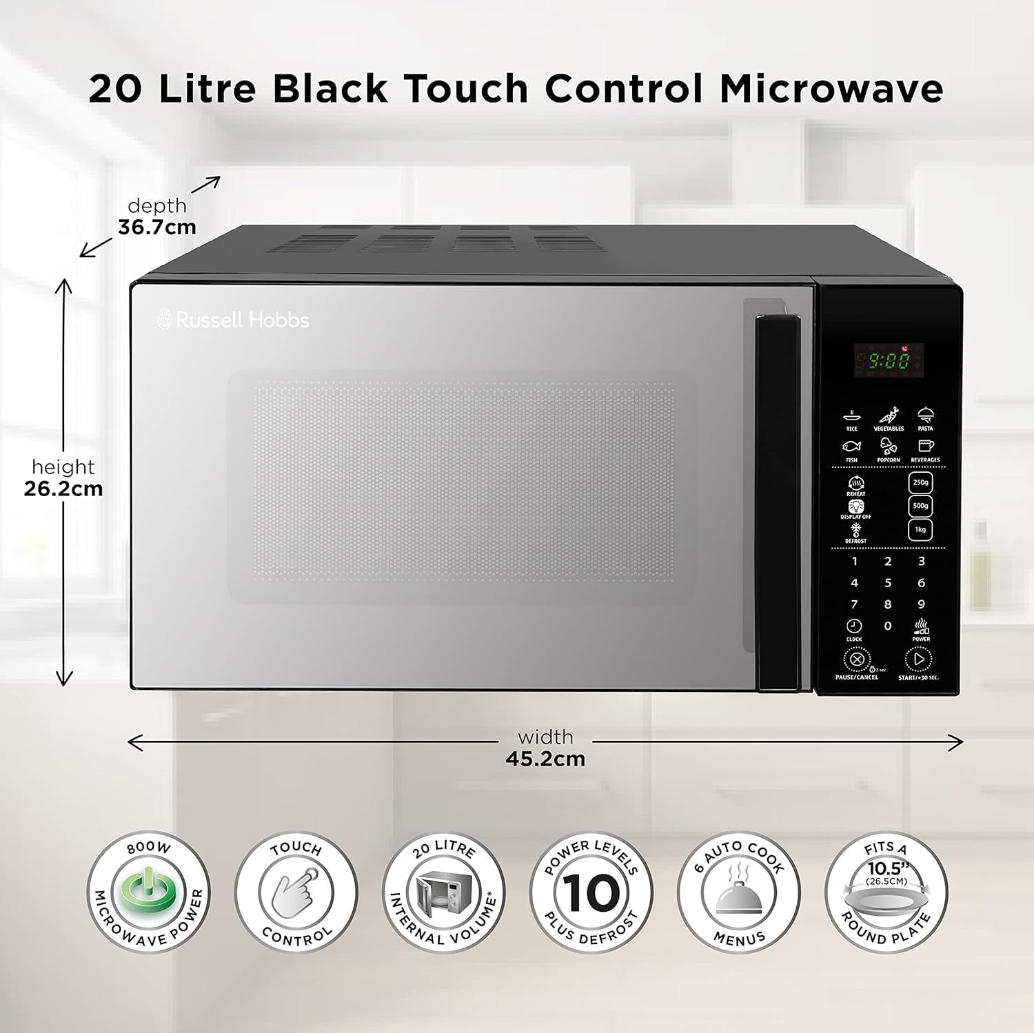 20L capacity with 800W of power Touch control digital microwave 99 minute timer Multi-stage cooking 6 auto cook menus for cooking convenience 10 microwave power levels to tailor your cooking experience Plastic free packaging Dimensions: (H)26.2 x (W)45.2 x (D)36.7 CMs