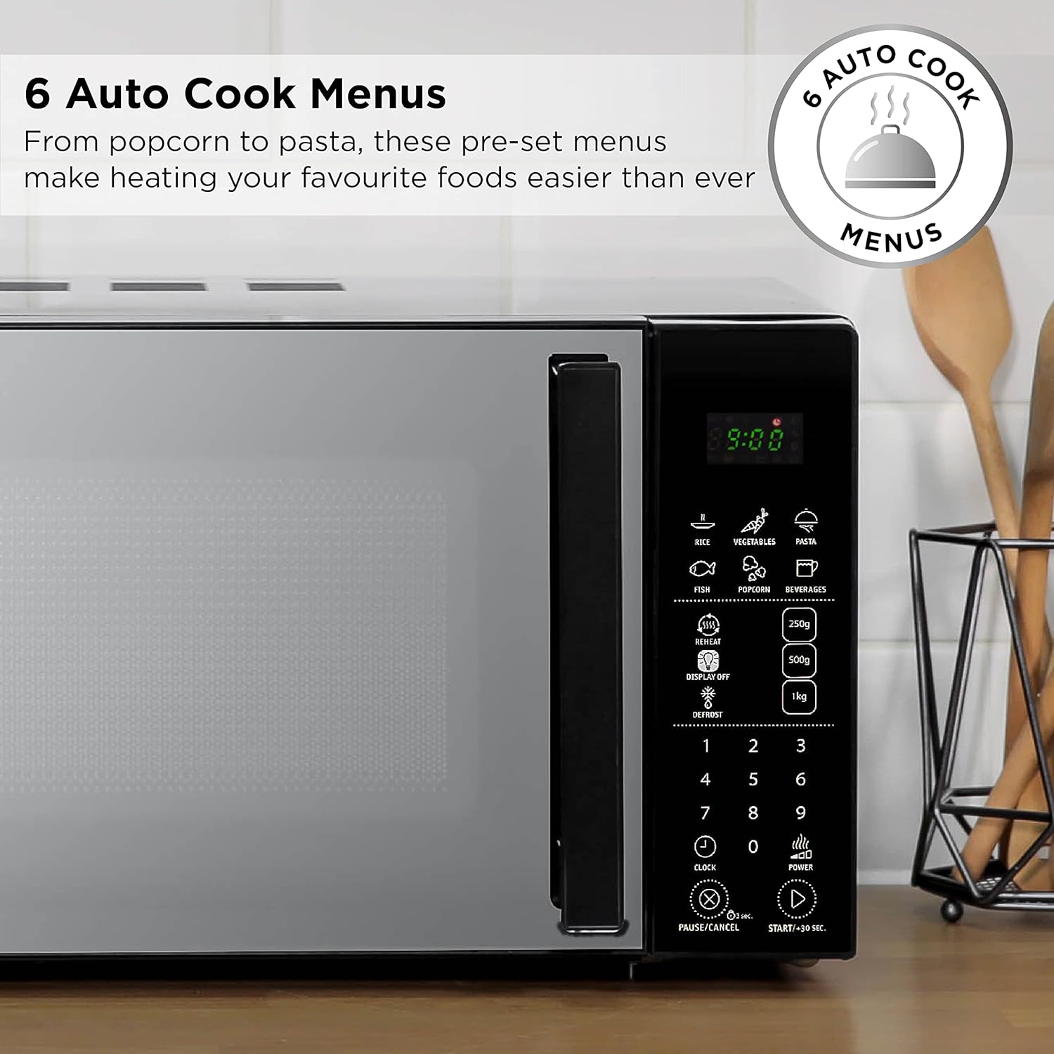 6 AUTO COOK MENUS – As well as simple microwaving and defrosting, you can choose from 8 pre-set cooking menus that make your life easier. Cook anything from popcorn to pizza, potatoes and even fish.
