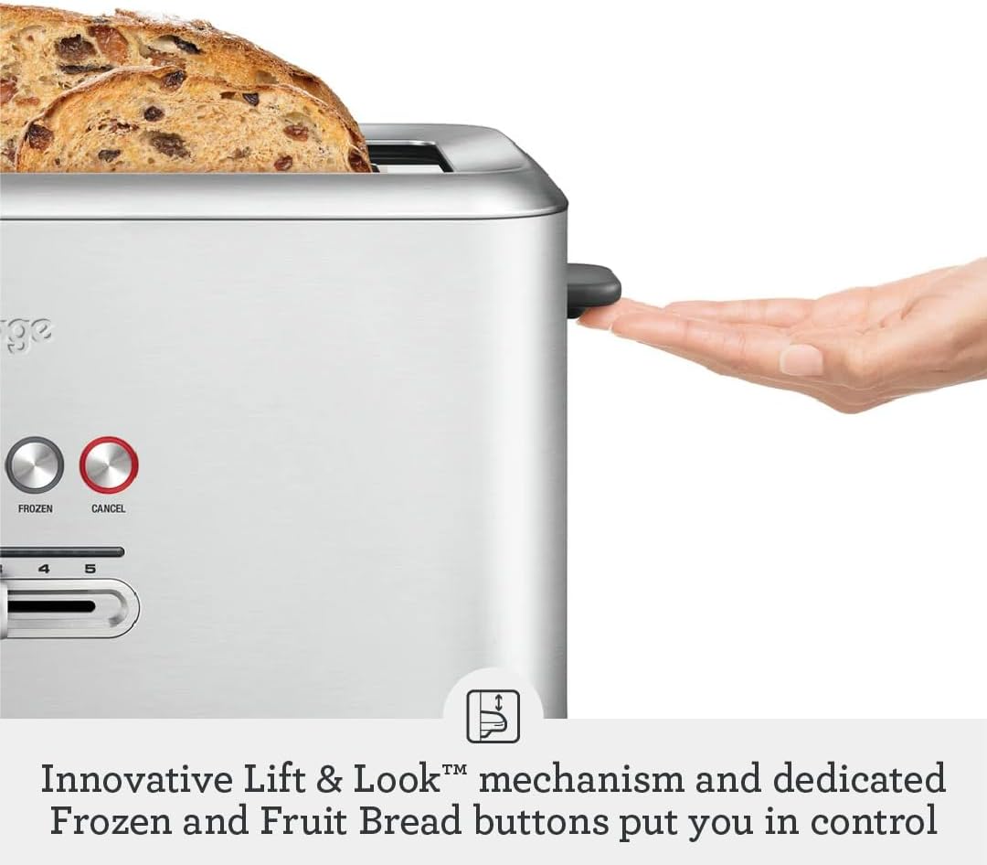 The Sage Bit More is a long 4-slice toaster with an LED that allows you to monitor your progress; If you feel you need ‘A Bit More’ simply press a button to add a little extra time to the toasting cycle or check on your toast with “Lift & Look”