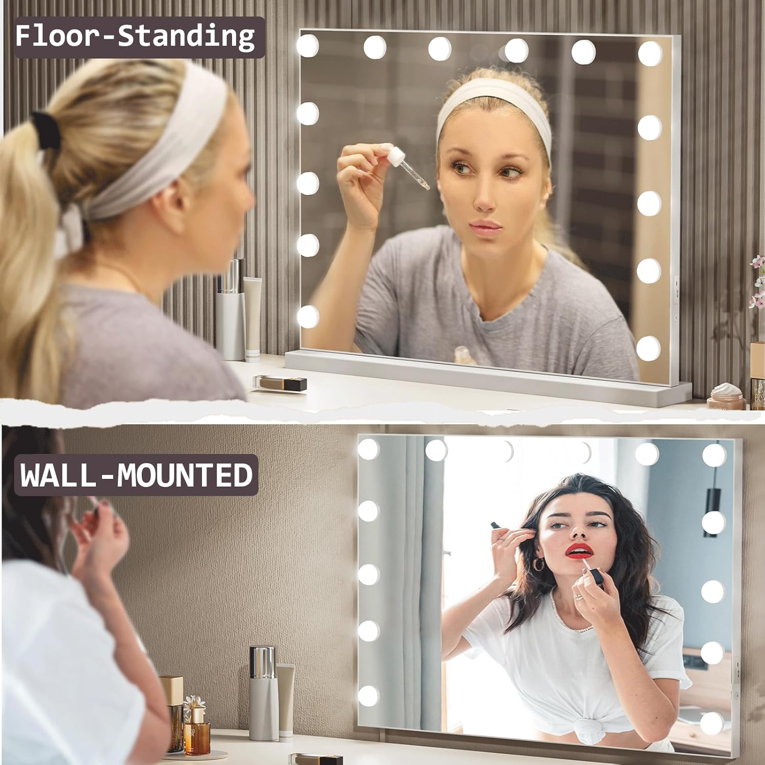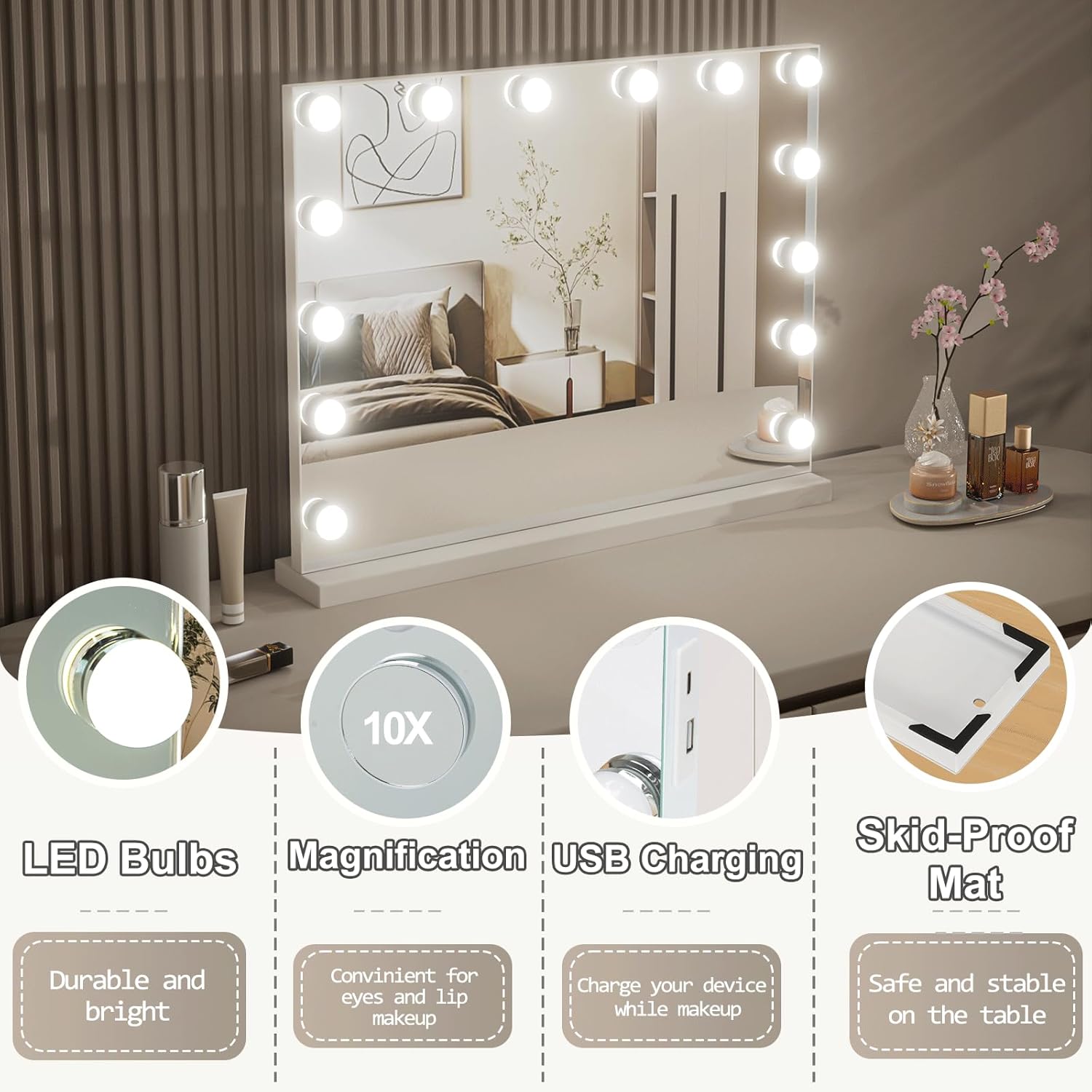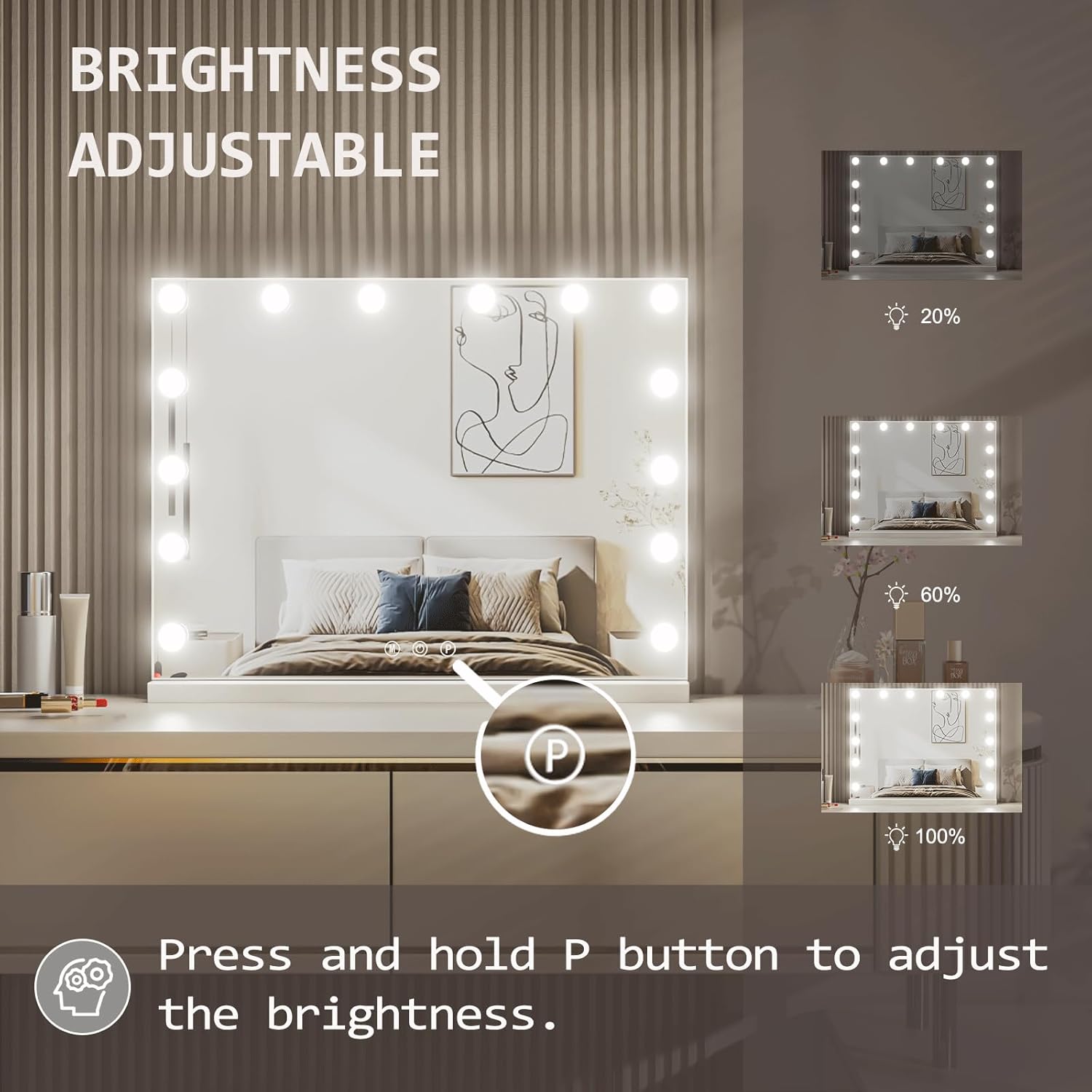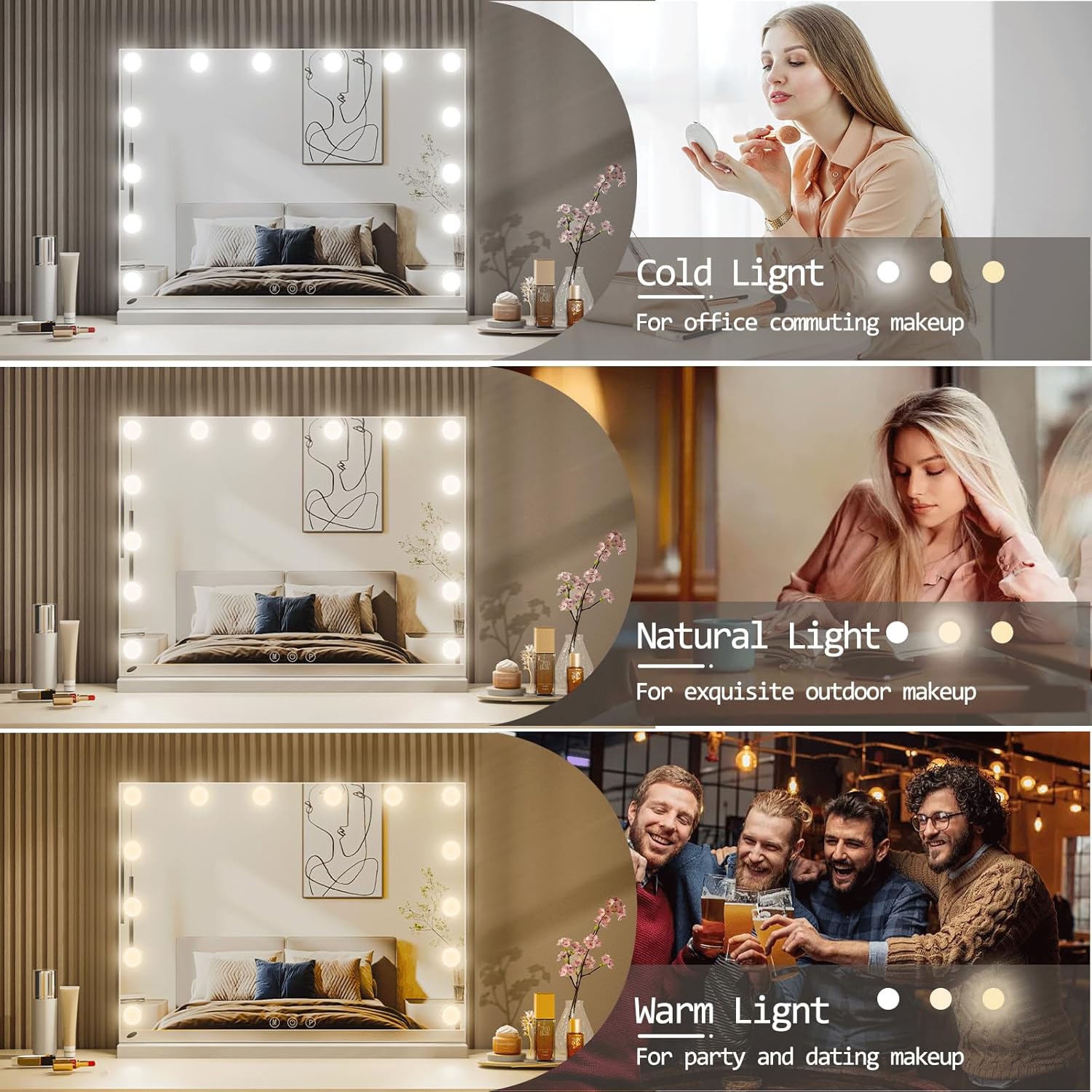𝗟𝗶𝗴𝗵𝘁𝗶𝗻𝗴 𝗔𝗱𝗷𝘂𝘀𝘁𝗮𝗯𝗹𝗲: Hollywood mirror equip 14 LED bulbs ( 3 colors to change: warm white, natural white and cold white; Press and hold button P to adjustable brightness 1-100% )