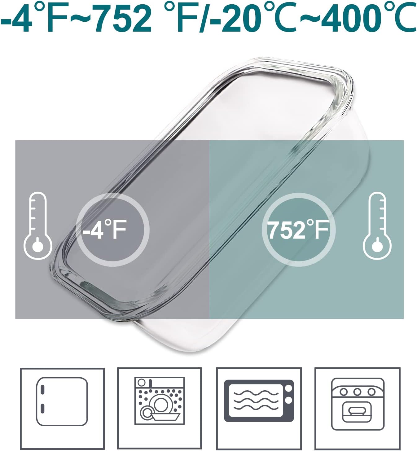 Safe for Oven/Microwave/Freezer: The glass food storage containers are made of premium borosilicate glass, hard and not easy to break. The glass containers can withstand -4℉~752 ℉(-20℃~ 400℃), and safe for microwave/oven (not the lid) and freezer.