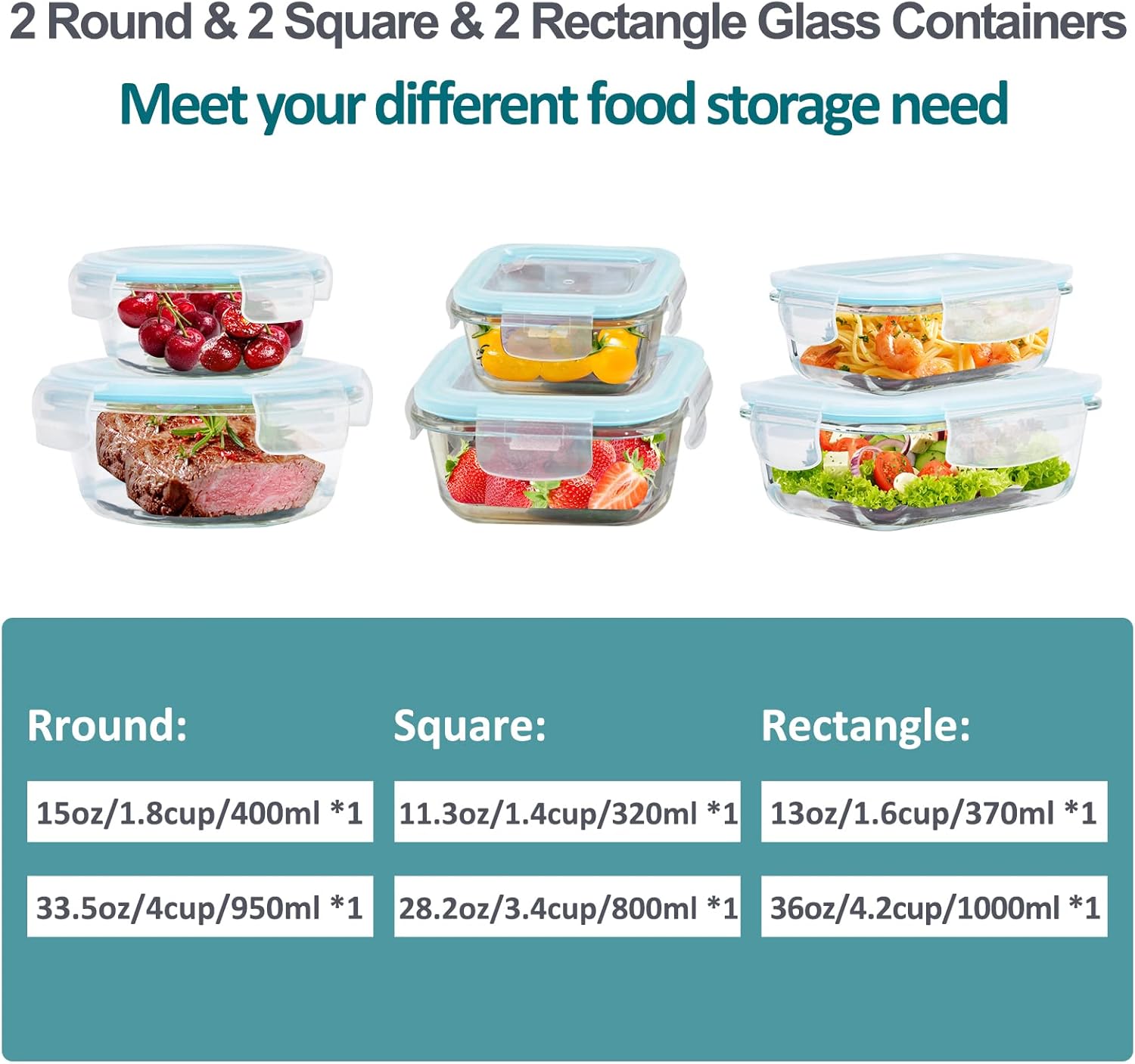 Glass Food Storage Containers 12 Piece: 6 glass containers with 6 lids of various sizes and shapes, include round glass containers 950mlx1, 400mlx1. Square glass containers 800mlx1, 320mlx1. Rectangle glass containers 1000ml x1, 370mlx1. Meet your different food storage needs.
