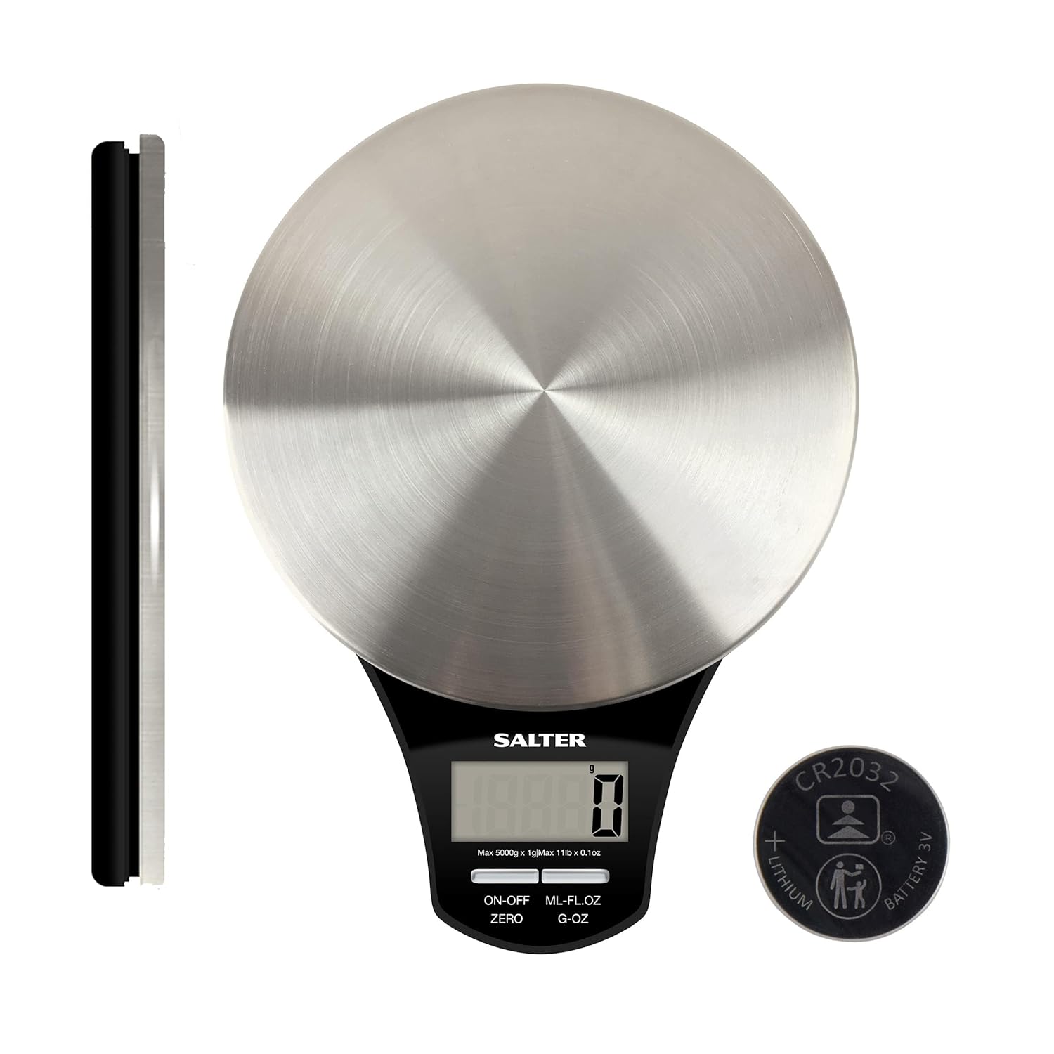 Salter 1035 SSBKDR Digital Kitchen Scale – Food Scales, Kitchen Weighing Scales, 5kg Capacity, Stainless Steel Platform, Measure Liquids, Add & Weigh , Tare/Zero Function, 1 x CR2032 Battery Included