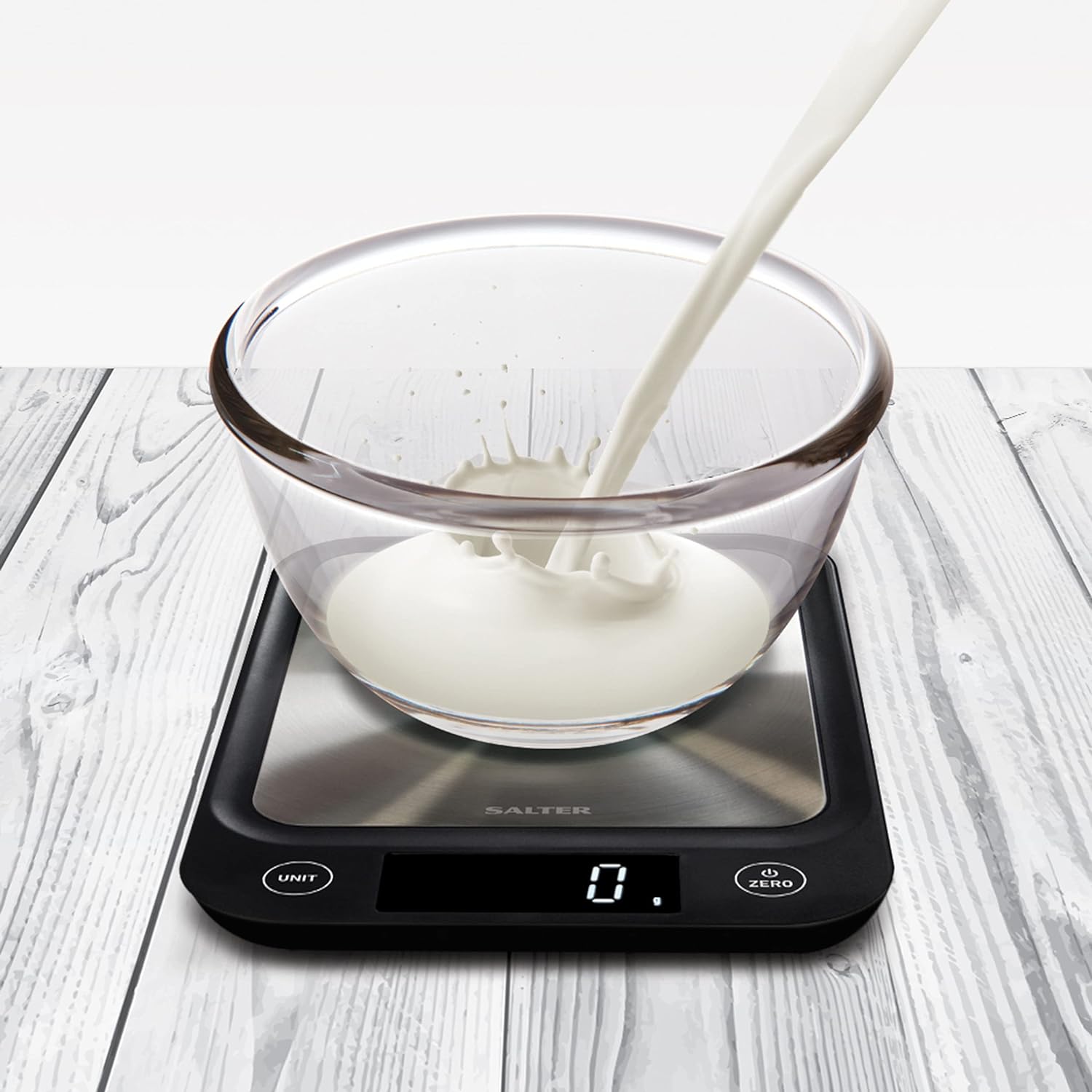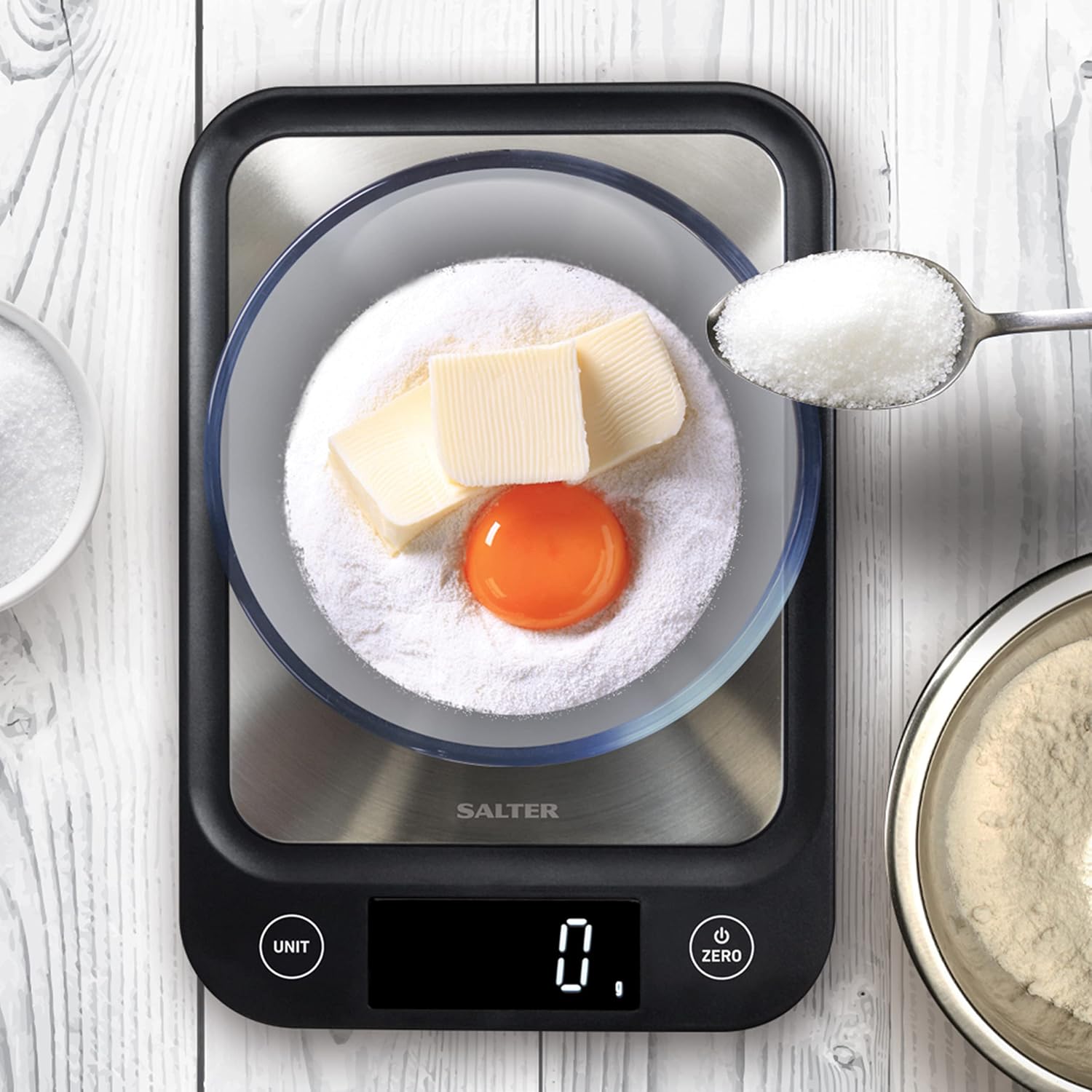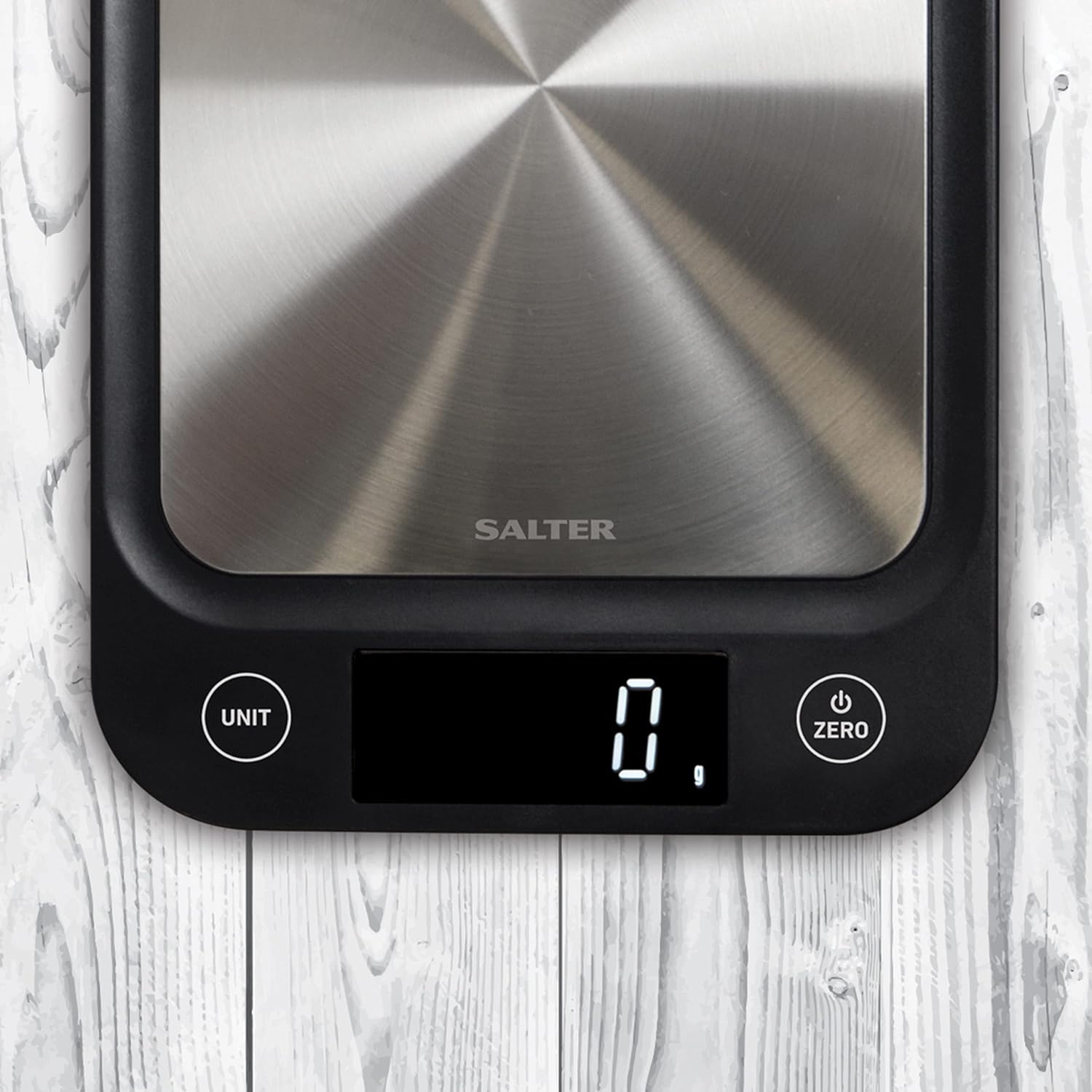 Salter 1068 SSBKDR Digital Kitchen Scale – Ultra Slim Baking & Cooking Food Scale, Stainless Steel Platform, Backlit LCD Display, Add & Weigh Function, Measure Liquids, 5kg, Includes 3 x AAA Batteries
