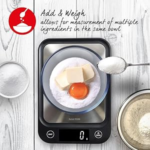 Perfect for fun, family baking, this scale has an ‘add and weigh’ and ‘zero’ function for measuring multiple ingredients in one bowl.