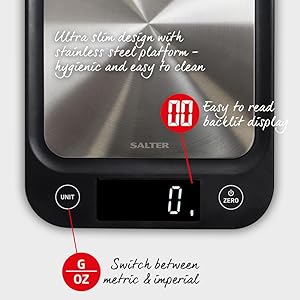 Boasting a stylish, hygienic stainless steel platform, the Ultra Slim Electronic Scale from Salter is a perfect compact kitchen scale.