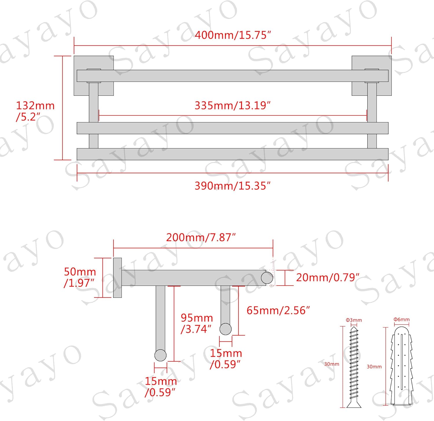 Dimension: 400MM * 200MM * 132MM(L*W*H), screws and anchors included. The length of hanging towels is 335MM.