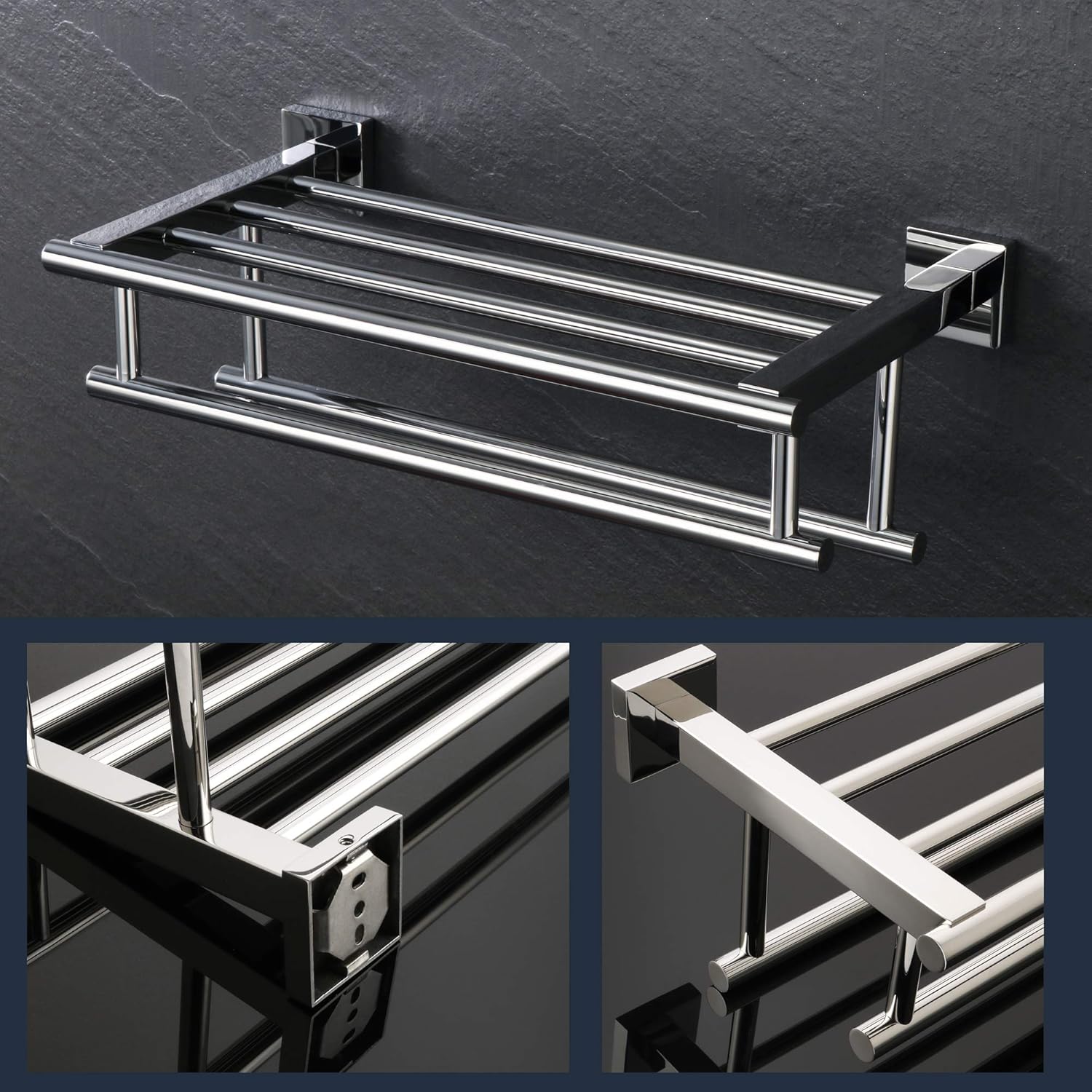 Minimalist Design: Square Bases design with double towel bars and whole body without screw hole highlight a simple and elegant appearance, suitable for diverse styles of decoration in home and hotel.