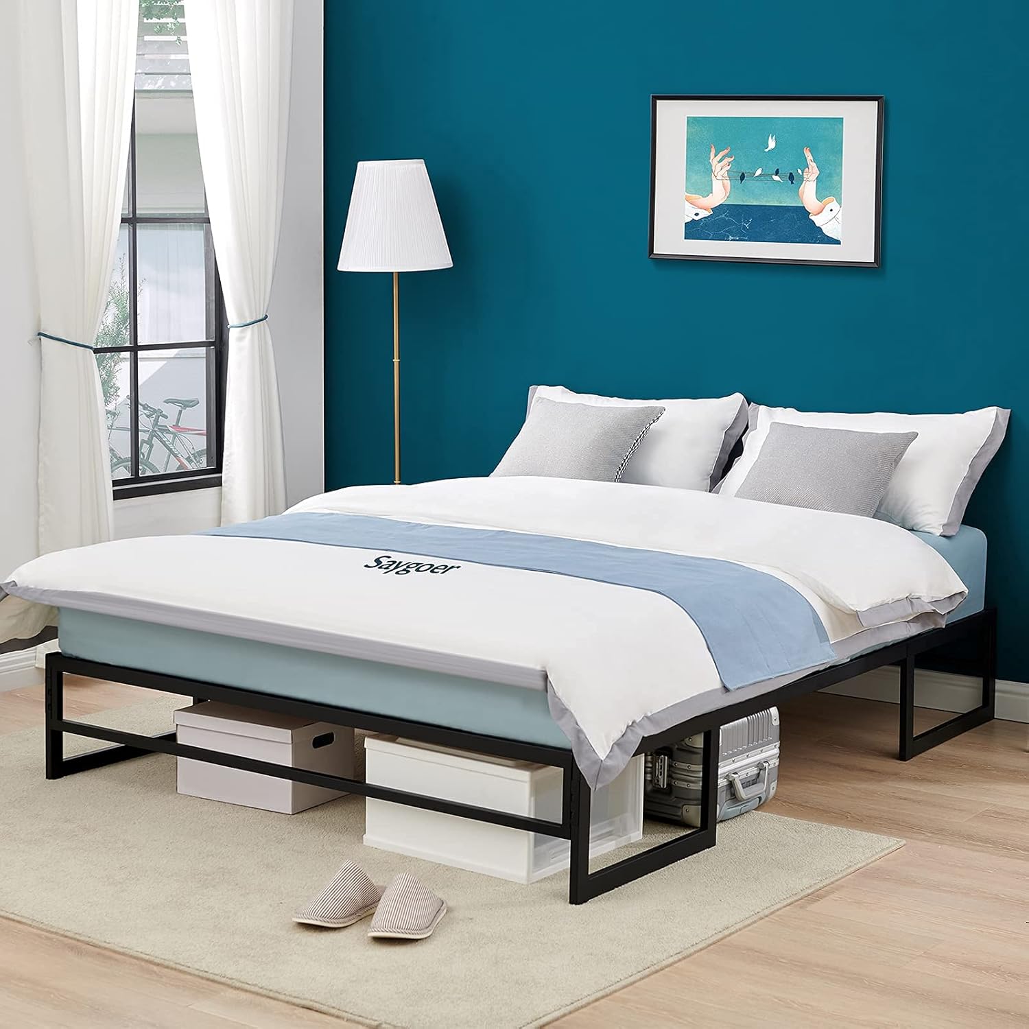 SAYGOER Double Bed Frame Base 31.5cm Metal Platform Mattress Foundation Frames No Box Spring Needed Heavy Duty Steel Slat Support Underbed Storage Space Noise Free Non-Slip Easy Assembly, 191x137cm
