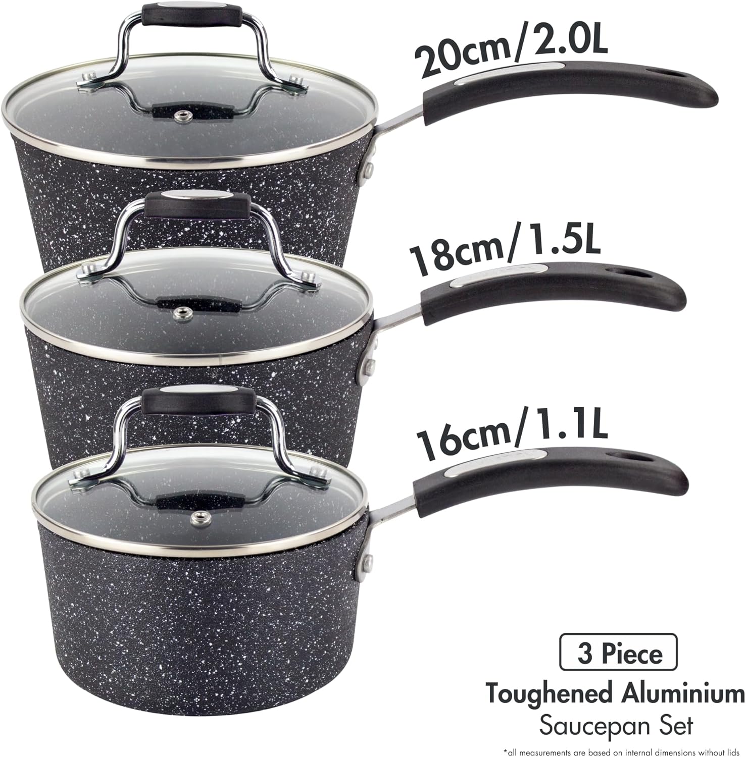 3 PIECE SAUCEPAN SET WITH LIDS: These versatile saucepans are ideal for preparing a variety of delicious meals. The set includes saucepans in sizes of 16cm, 18cm, and 20cm, each with a tempered glass lid.