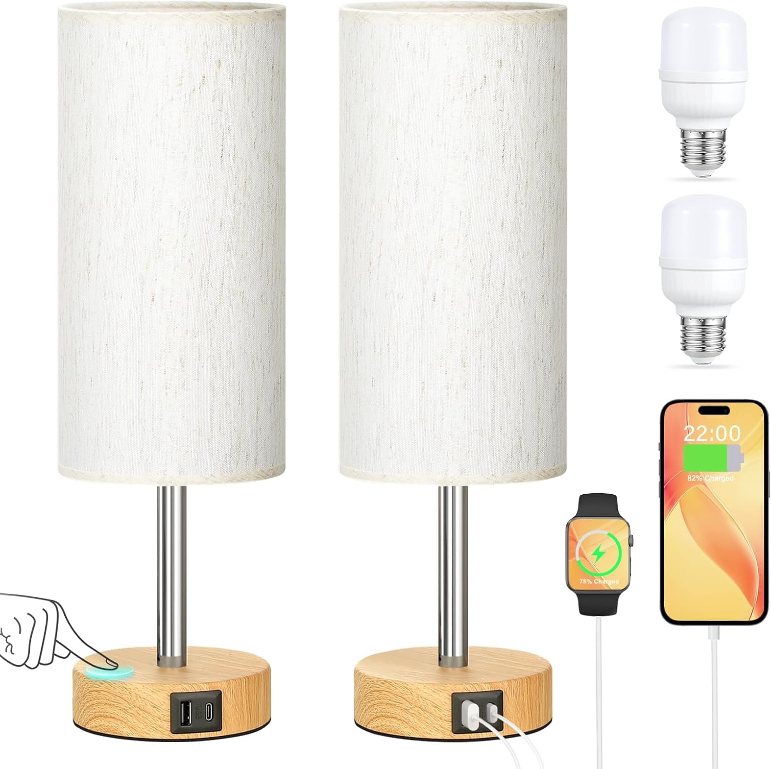 Seealle Wood Bedside Lamps with USB A+USB C Charging Ports, 3-Way Dimmable Touch Lamps