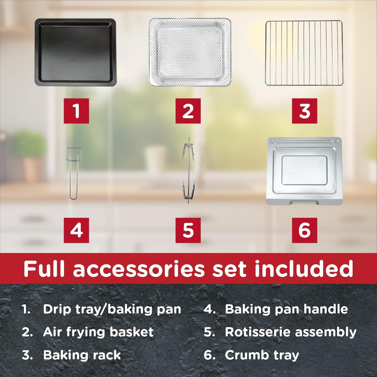 ACCESSORIES INCLUDED: Full accessory set to make it easy to cook what you want. Full set includes rotisserie set, food tray, deep frying basket, bake tray handle, crumb tray and wire rack. RECIPES: Specially designed for our air fryer oven to get you started.