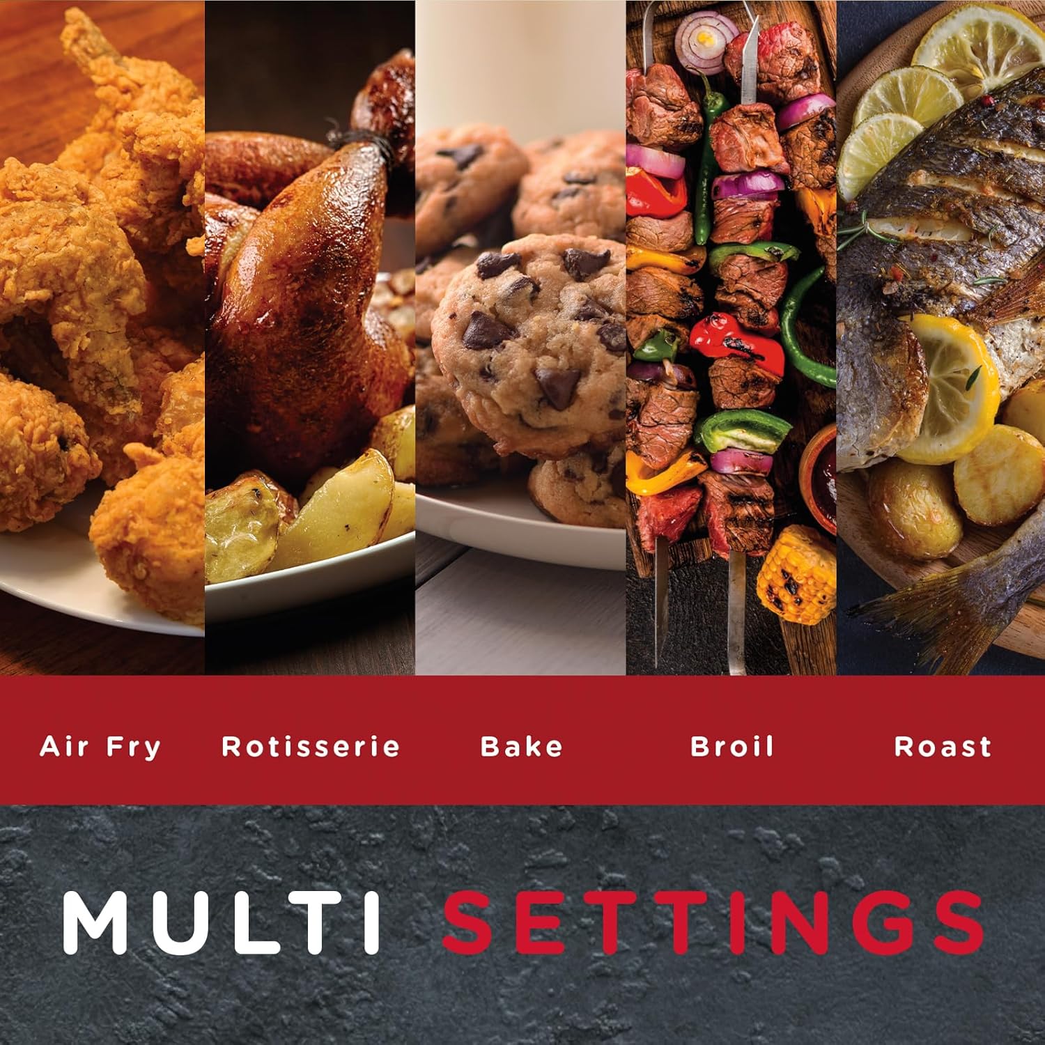 MULTIFUNCTIONAL: Multiple settings including Air Fry, Rotisserie, Bake, Broil and Toast means the limits of what you can make are your imagination. Just some foods that can be cooked include whole chicken, pizza, fish, steak, toast, vegetables, wings, french fries etc