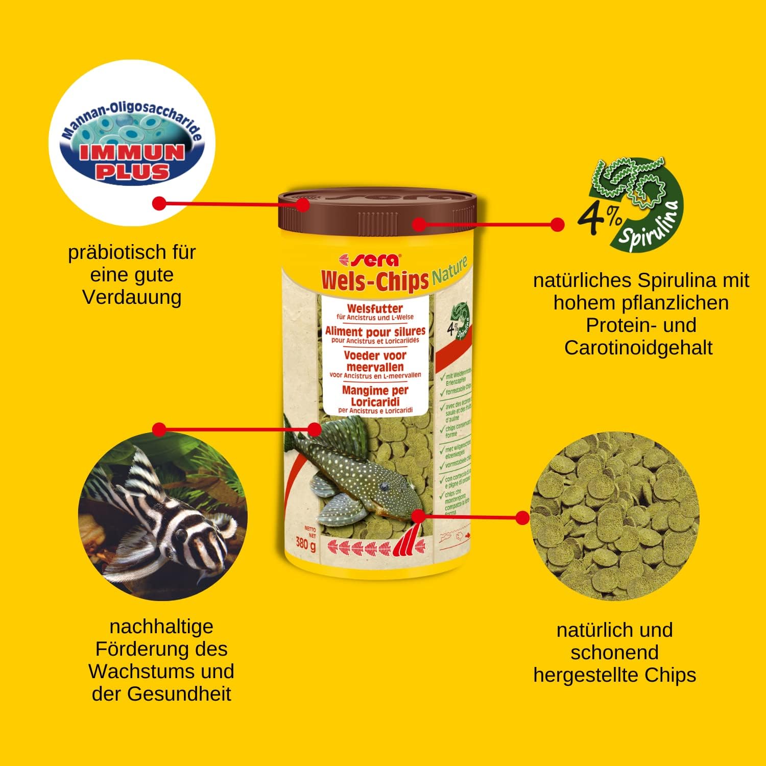sera Catfish Chips Nature is the staple food without dyes and preservatives for rasping and suckermouth bottom fish such as Ancistrus and plecos.