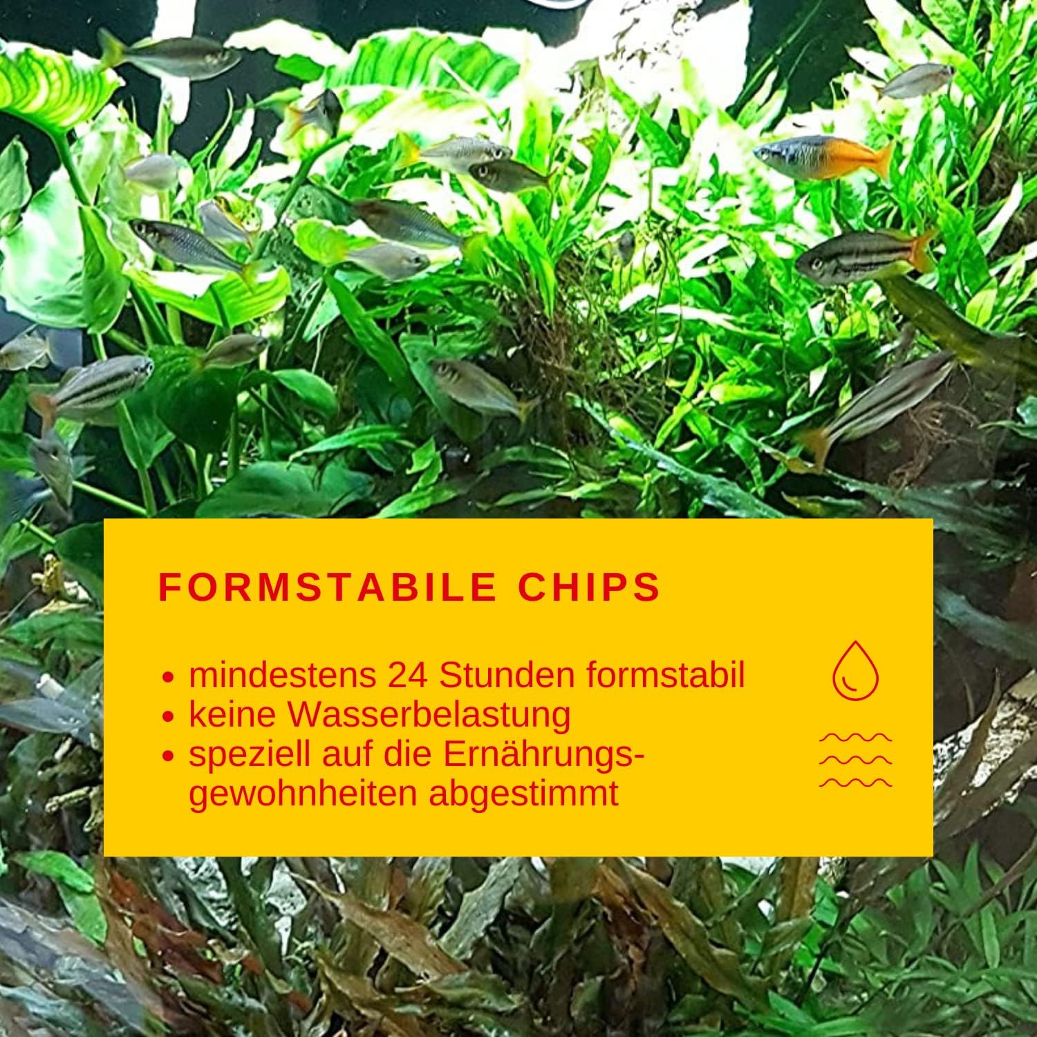 The quickly sinking chips become smooth in water, keep their shape for at least 24 hours, and do not pollute the water. They therefore allow the mainly nocturnal catfish eating slowly without any problems, which meets their natural feeding habits.