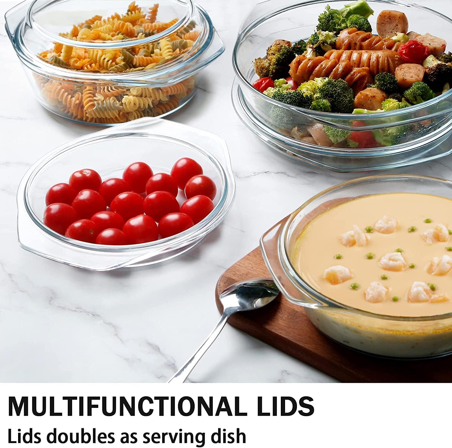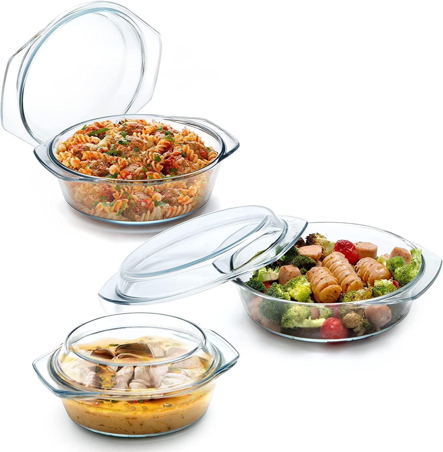Set of 3 Glass Casserole Dishes with Lid, 1+1.4+1.7L Round Lidded Casserole Dish & Handles Oven Proof, Microwaveable