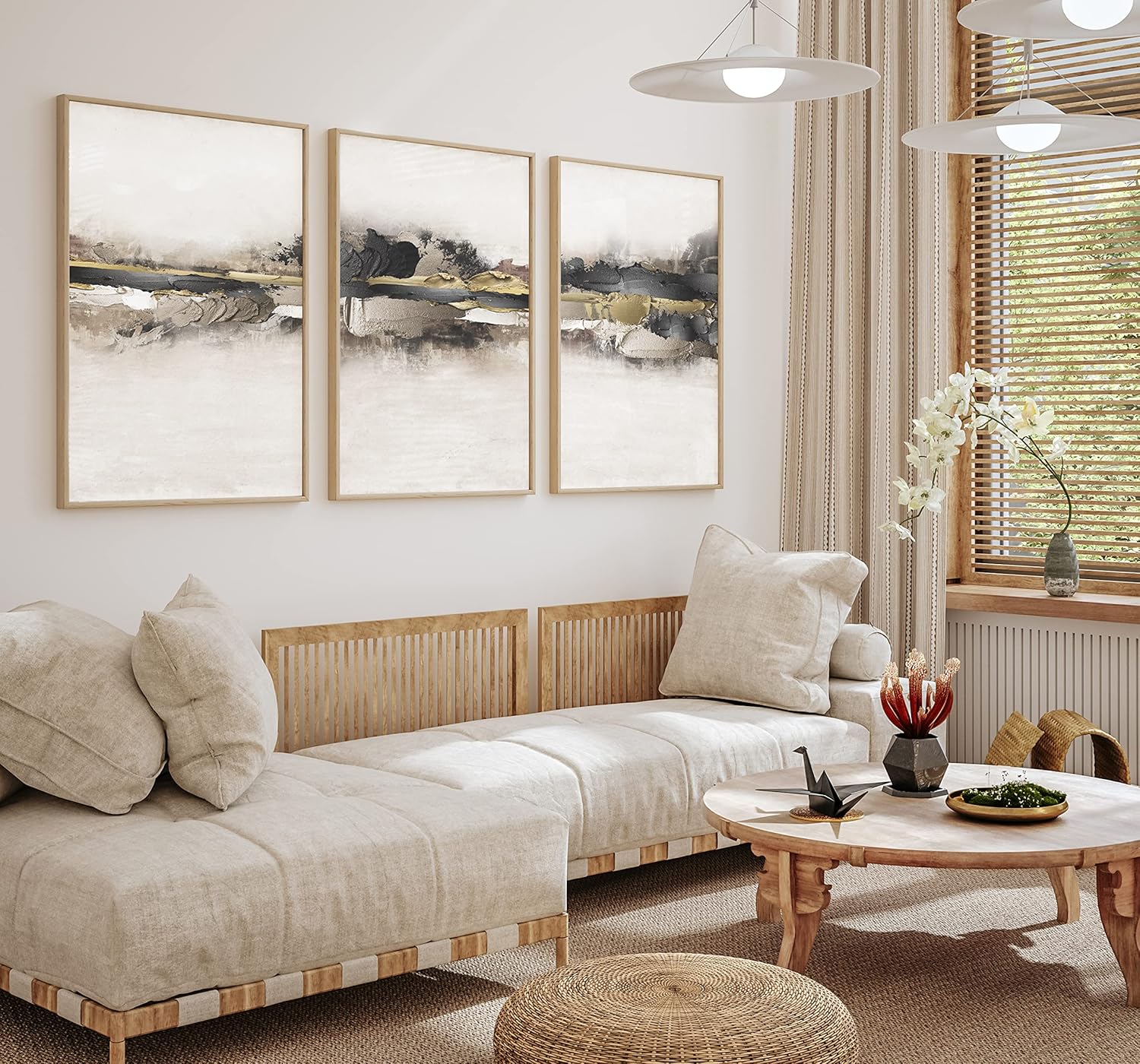 Set of 3 Neutral Abstract Art Prints with a vibrant Gold, Black and Cream colour theme. Choose either A4 (21cm x 29.7cm, A3 (29.7cm x 42cm), A2 (42cm x 59.4cm), 50cm x 70cm or A1 (59.4cm x 84.1cm). Prints are printed onto a professional heavyweight 300gsm pearl paper gving these Abstract Art Prints the luxurious finish they deserve.