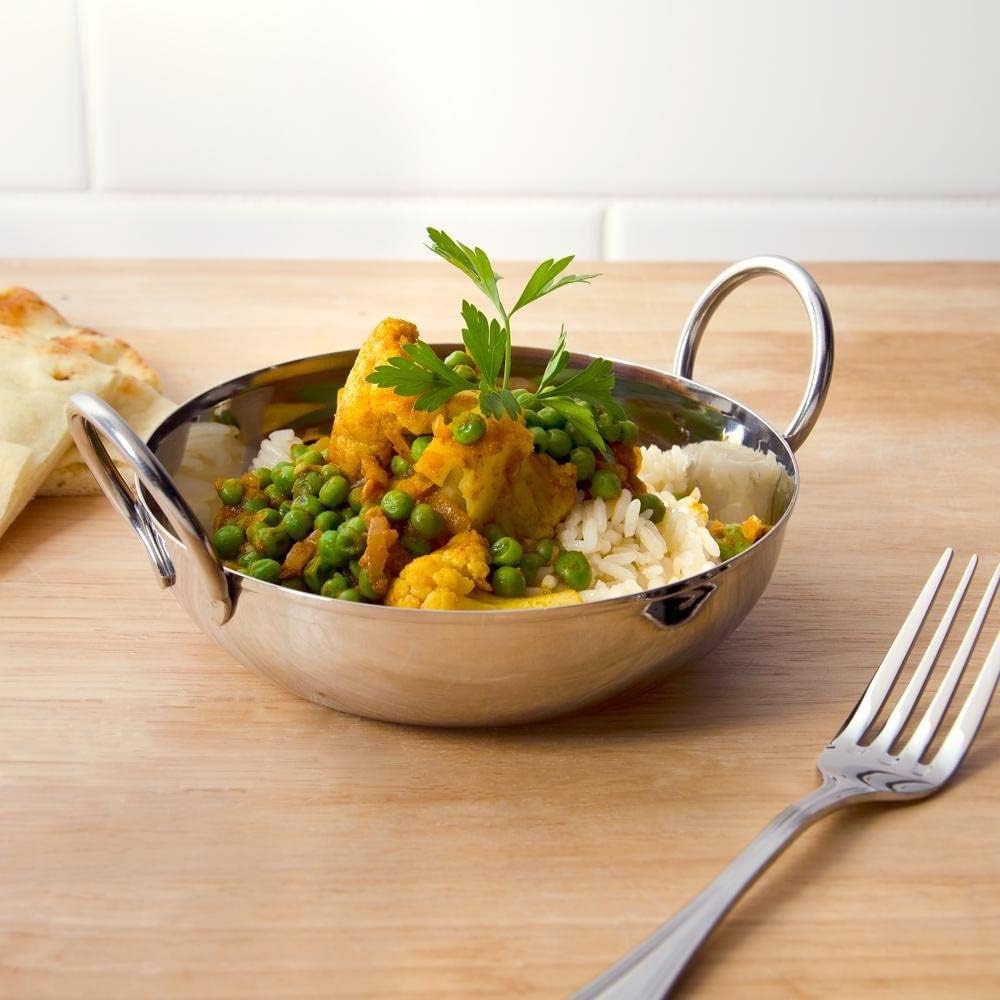 PREMIUM MATERIAL: The serving bowls are designed with premium quality stainless steel, the Balti dish retains heat well and spreads it evenly.