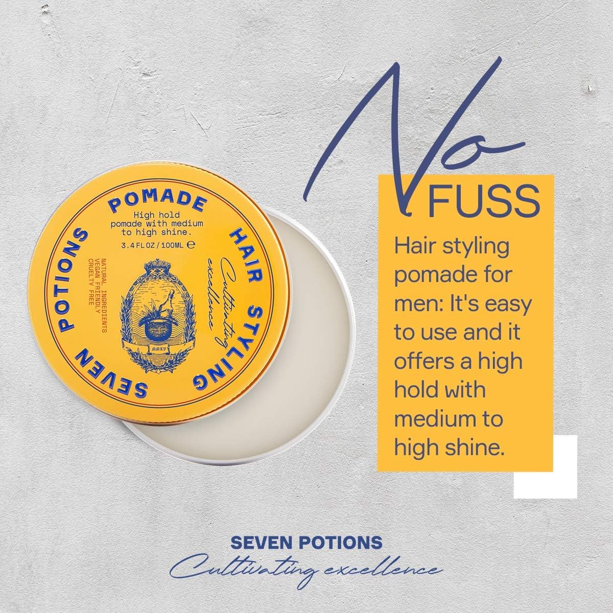 Seven Potions Men’s Natural Pomade — Natural, Water-Based, High Shine, High Hold Hair Styling Product — 100% Vegan, Cruelty Free (100ml)