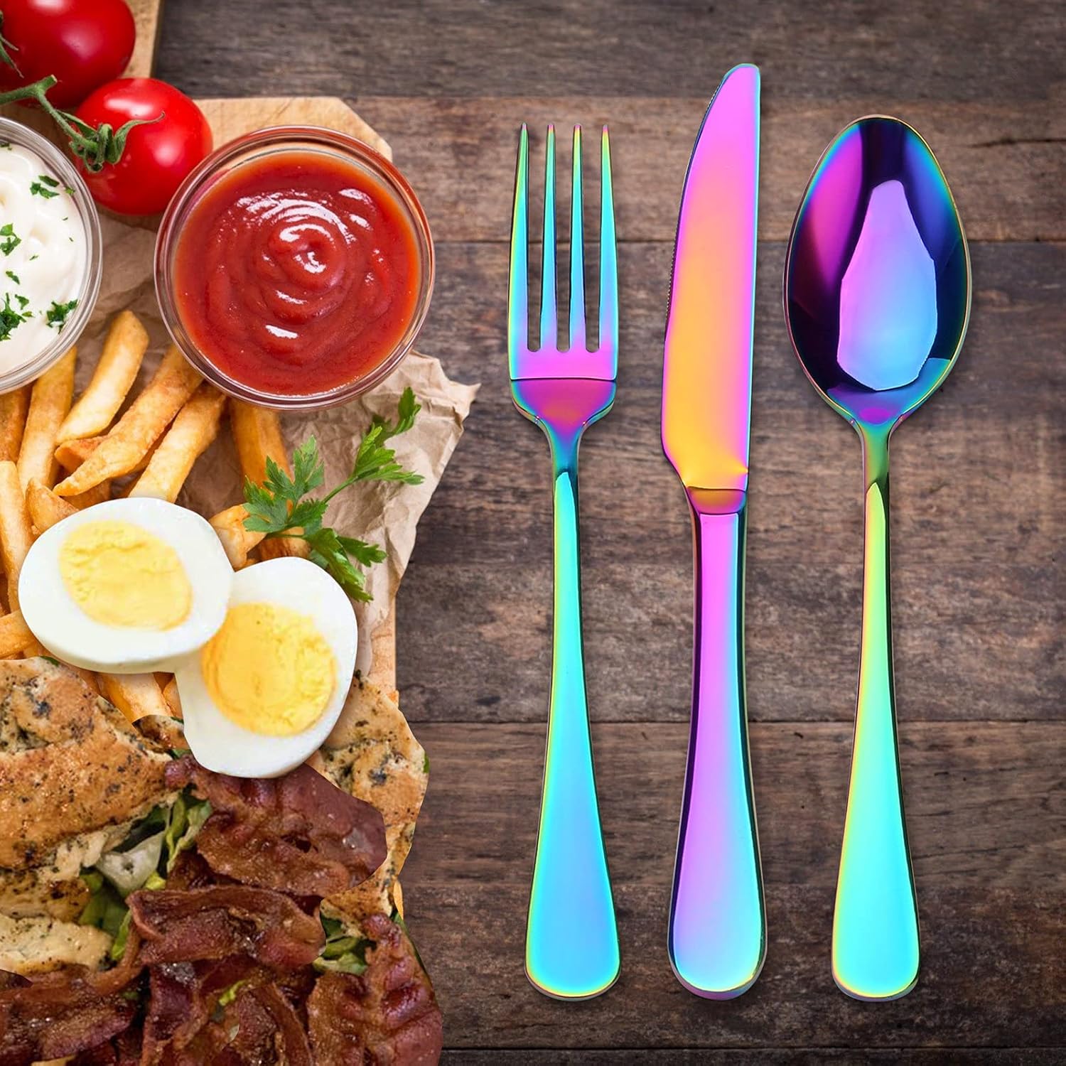 【DISHWASHER SAFE】-This stainless steel cutlery set is dishwasher safe,it is convenient to wash or storage,your appropriate care during use of your mirror rainbow cutlery set will keep it as good as new for many years.