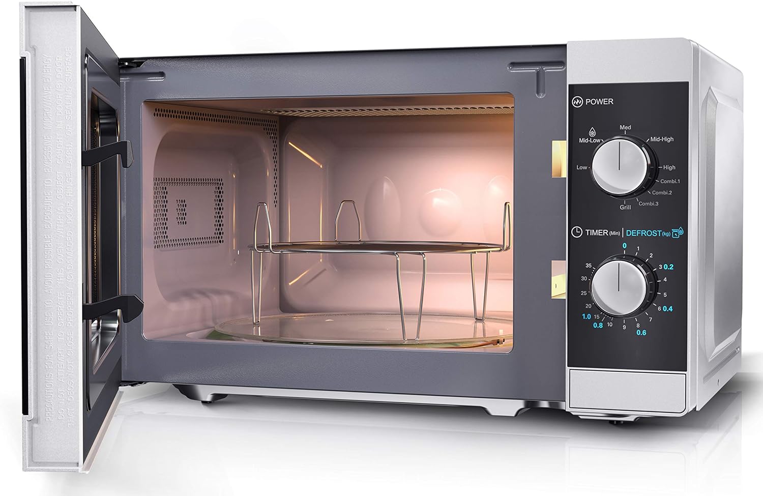 Stylish 800 watt microwave oven & grill: With a compact 20 litre capacity & a turntable inside, complete with 5 levels of cooking power & 4 grill settings