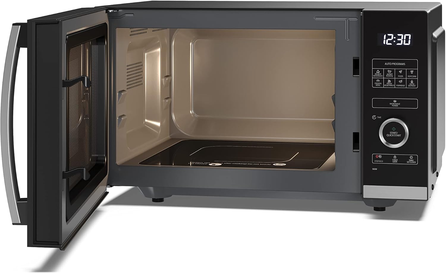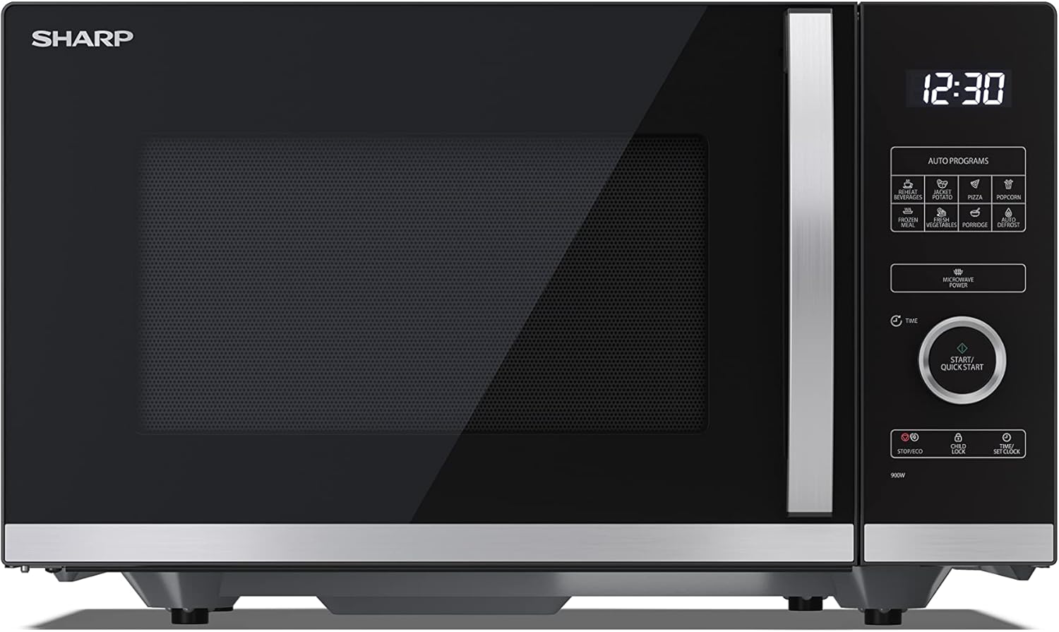 900 watt semi digital flatbed microwave: Part of SHARP’s unique flatbed range. Large 25L capacity, energy-saving eco mode and sleek black with a silver pull handle makes this ideal for any kitchen