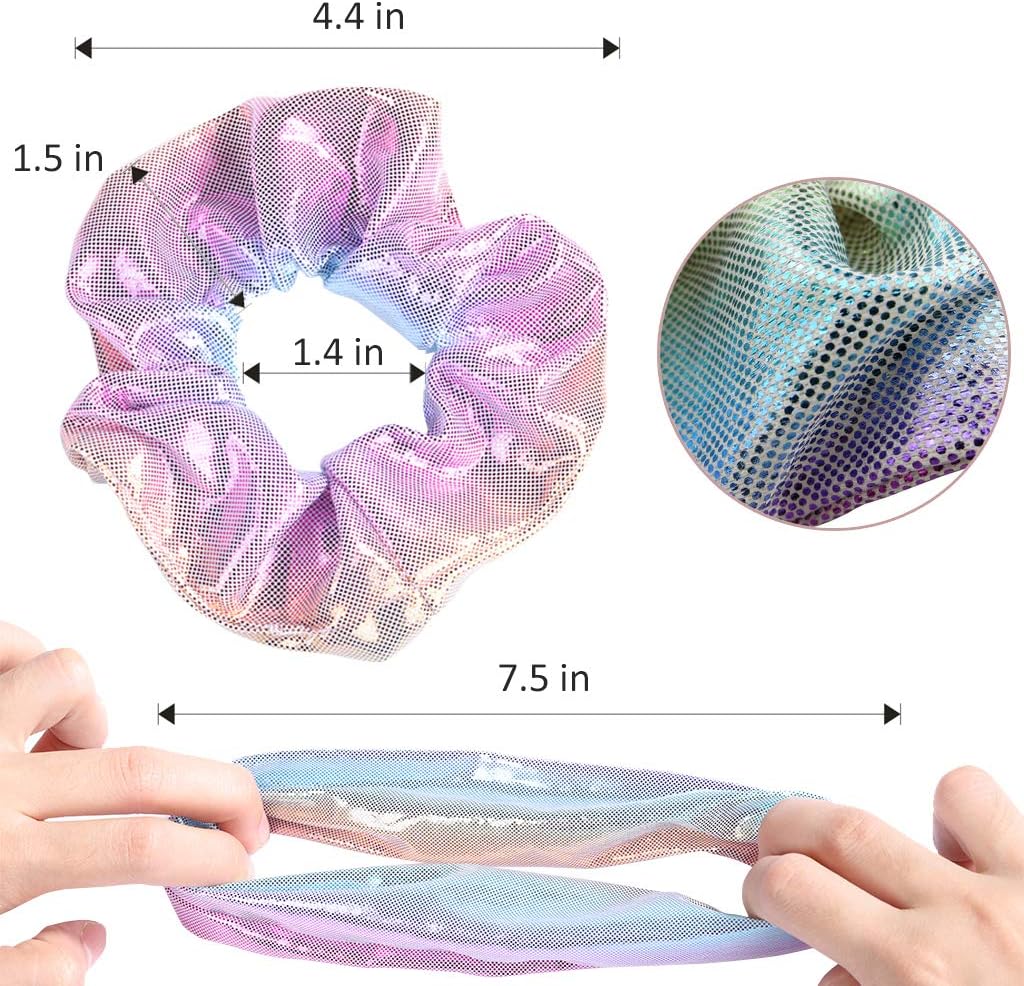 Material: Shiny holographic fabric and durable elastic bandInner diameter: 3.5cm/ 1.4inchesOuter diameter: 11cm/ 4.4 inchesMAX stretched diameter: 19cm / 7.5 inches4 styles: each scrunchy with two side gradient mermaid colorsQuantity: 12 Pieces for one set