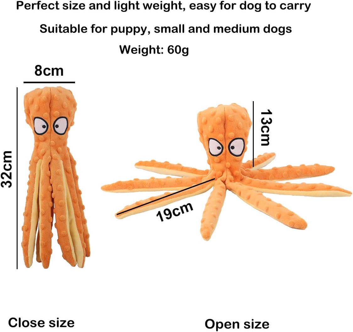 1.32cm long, light weight, easy for dogs to carry suitable for puppy, small and medium dogs.2.Octopus design animal design dog toys are cute and funny, satisfy your pet’s natural hunting instinct.3.Soft and durable enough, perfect for chewing and teeth cleaning4.Stuffing free, you don’t need to worry about the dog will eat the stuffing and make room mess.5.Built in squeakers and crinkle paper, two kind of sounds, best for squeaker-loving dogs.6. Perfect gift for your 4 legs friends on Birthday, Christmas Day.