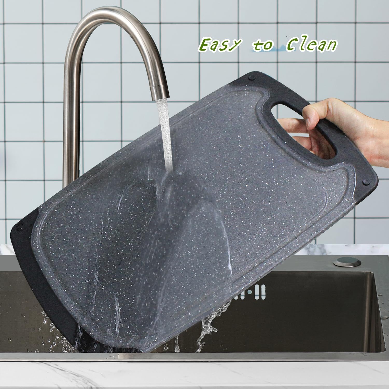 【Easy Grip Handle】The handle of the cutting board is wrapped with rubber, which can make the cutting board more stable on the tabletop. The handle design also allows the cleaned cutting board to dry and store faster.