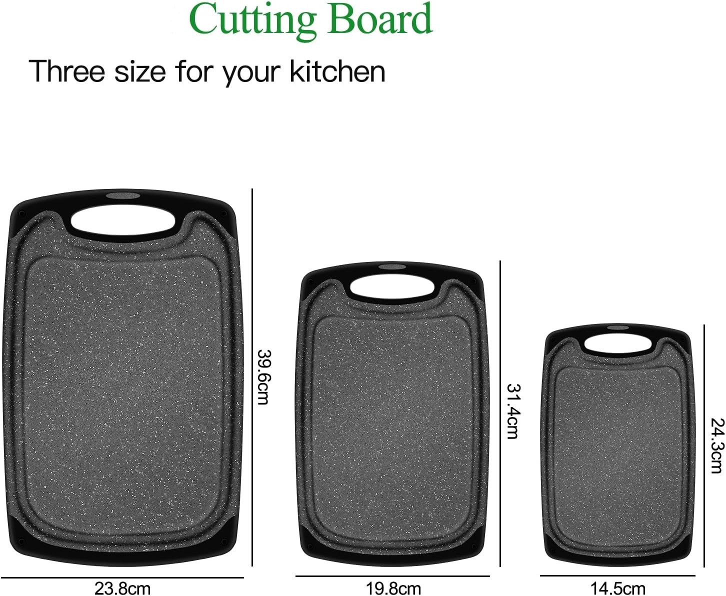 【3 sizes of cutting boards】Large(39.6×23.8cm), Medium(31.4×19.8cm), Small chopping board(24.3×14.5cm).The thickness of each board is 0.9cm. Each size of chopping board is designed for different kinds of food.